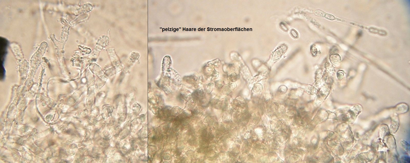 Die Sporen sehen im Ascus teils ganz schön irregulär aus, aber halt nicht in jedem Perithecium. Anfangs hatte ich mich kurz gefreut, vielleicht mal Hypocrea protopulvinata gefunden zu haben, aber mit den Oberflächenhaaren und Form der Mündungszellen kann das nicht sein.