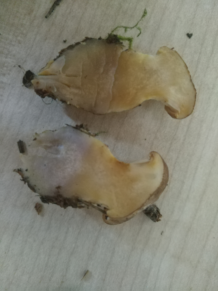 • Neben den Perlpilzen und den Rotfußröhrlingen habe ich drei kleine Flaschenstäublinge entdeckt, bei denen ich mir aber hinreichend sicher bin. Ausserdem ist mir dieser kleine Schwammerl aufgefallen, der mich von der äußeren Form her entfernt an einen Pfifferling erinnert. Dass es kein Pfifferling ist, weiß ich. Mich würde interessieren, was es ist. Ich habe ihn mitgenommen, um ihn zu bestimmen, aber es gelingt mir nicht. Wollt ihr mir helfen?