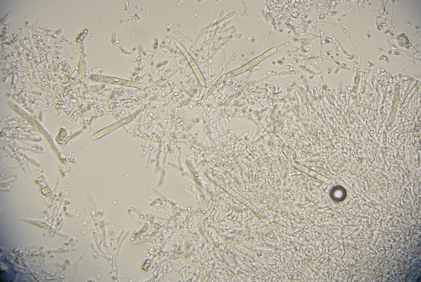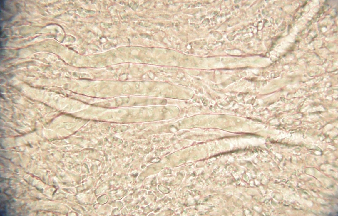 Die komische Zelle am unteren Bildrand kann schon gut eine Gloeozystide sein. Auch aufschlussreich: Wenn es keinerlei dickwandigen Elemente zu finden gibt.