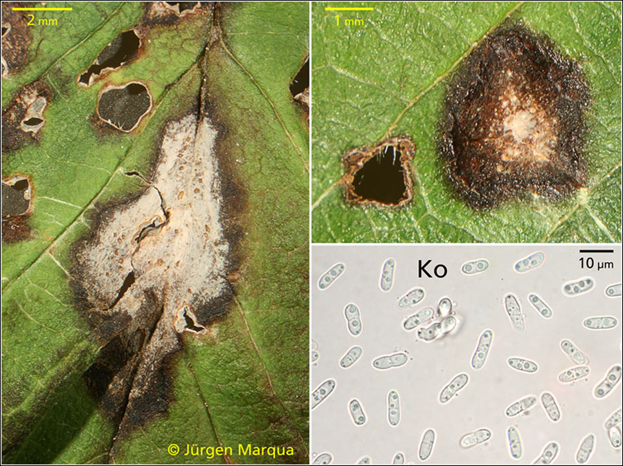 Vermutlich gehört das zur Verbreitungsstrategie solcher blattparasitierenden Pilze: Das abgestorbene Wirtsgewebe fällt mitsamt den Fruchtkörperbildungen (Acervuli, Pyknidien) zu Boden, und der Pilz kann sich dort weiterentwickeln (Überwintern, Teleomorphen bilden ...).