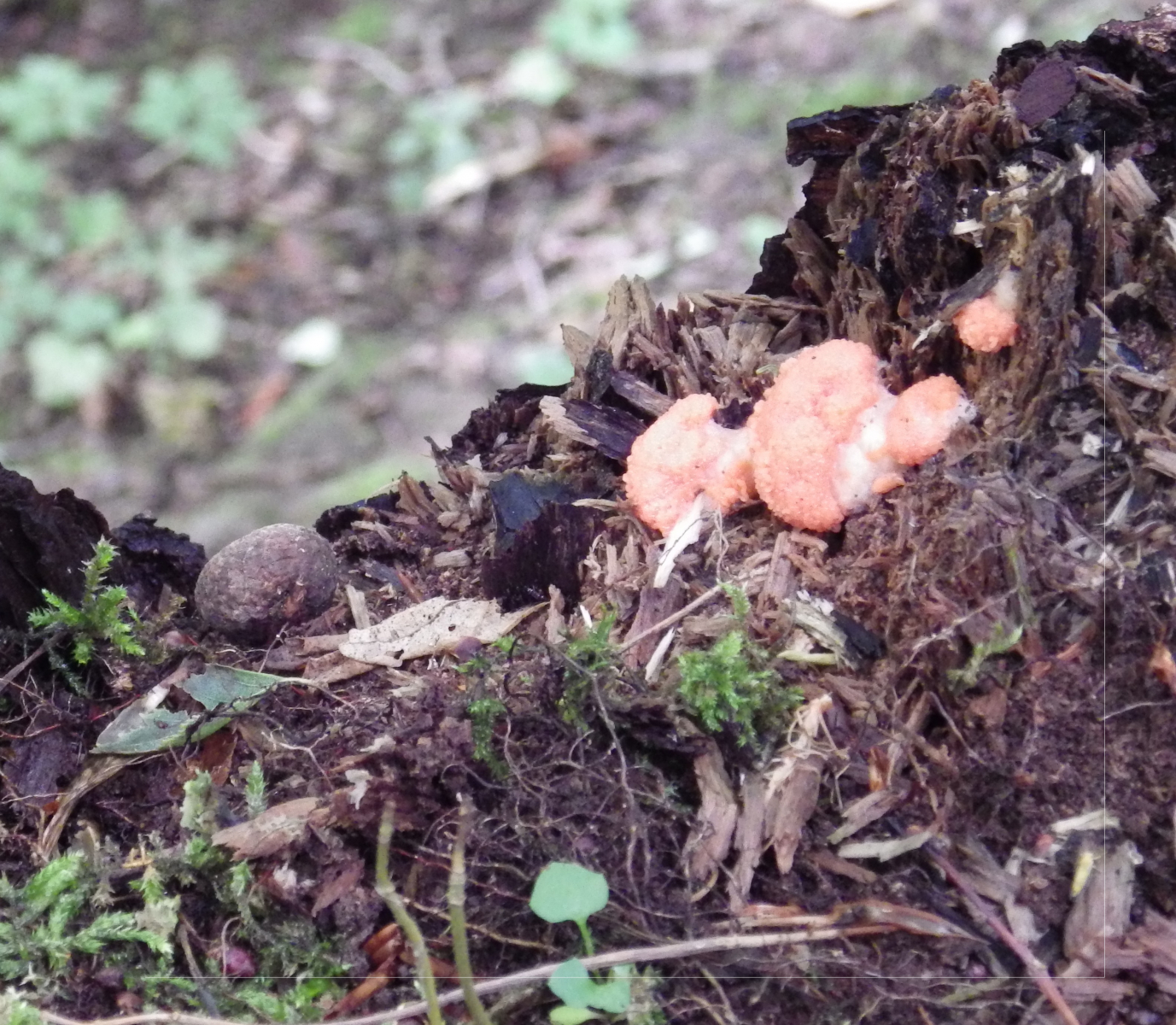 Genau, Tubifera ferruginosa (Lachsfarbener Schleimpilz) und Stockschwämmchen.