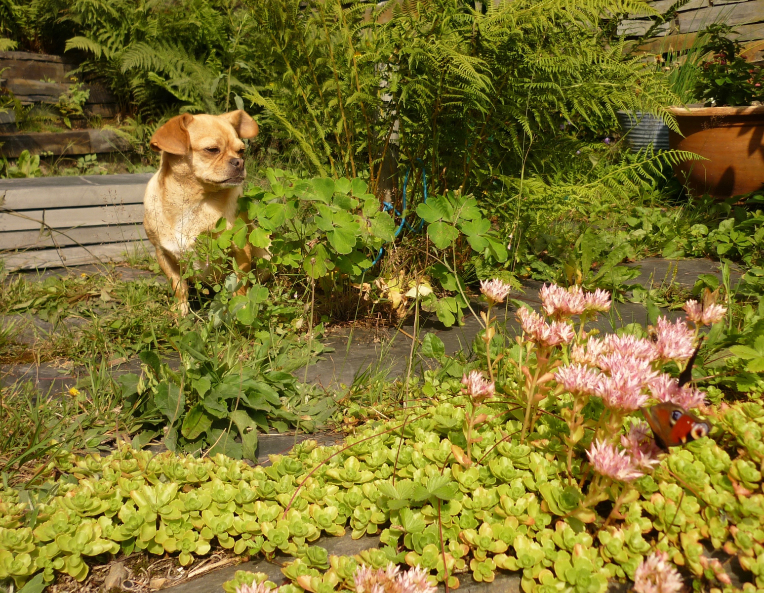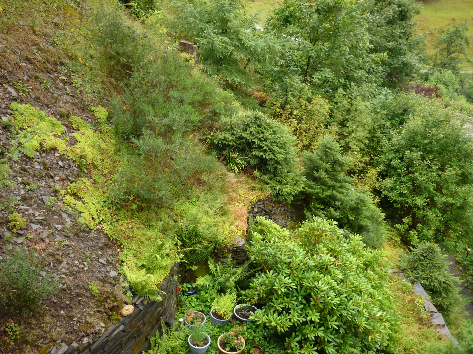Garten ist übertrieben. Viel Gartengewächse schaffen es hier nicht. Das ist ein alter Schiefersteinbruch am Haus, bei dem ich mit allerlei Pflanzen bei der Begrünung nachhelfe. Aber viele Kräuter wachen hier ohnehin. Frauenmantel, Sandthymian, Goldfelberich, Oregano, Fingerhut, Weidenröschen u.a.. Langweilig wird's nie. Mit Taglilien, Alant, Akelei, ein paar Rhododendron habe ich nachgeholfen. Küchenkräuter sind in Pflanzkübeln. Das Sedum ist inzwischen verblüht. Bei mir saßen die Falter zuletzt auch am Oregano auf der Westseite des Hauses. Schaun wir mal, was nach dem Regen an Faltern noch übrig ist.