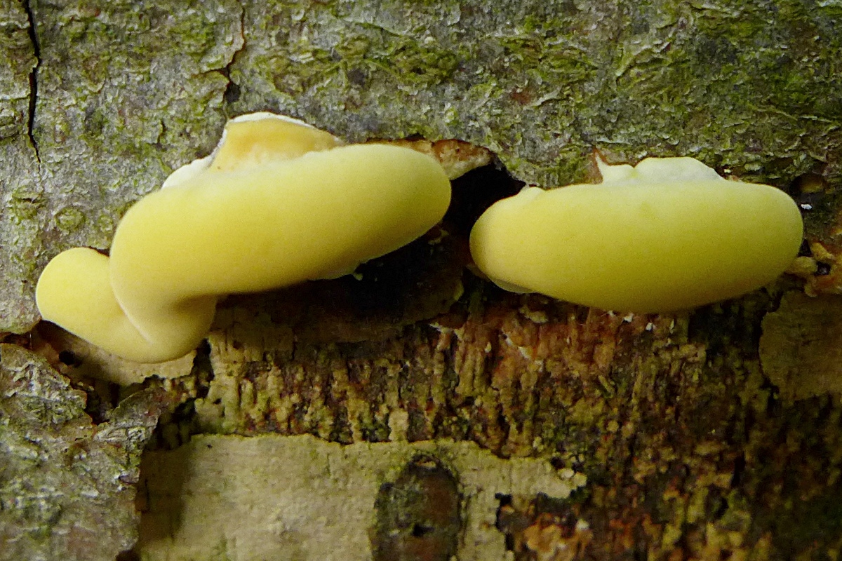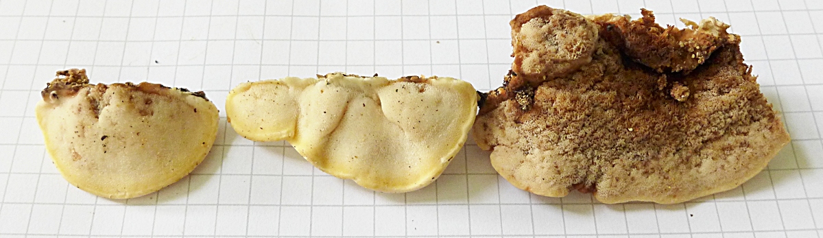 ältere Pilze ganz gelb-orange bräunlich (die hatte ich ursprünglich für weitere Art gehalten, man sieht aber Stellen, wo die Erscheinungen ineinander über gehen - bei Trocknung sind alle Pilze sehr ähnlich)