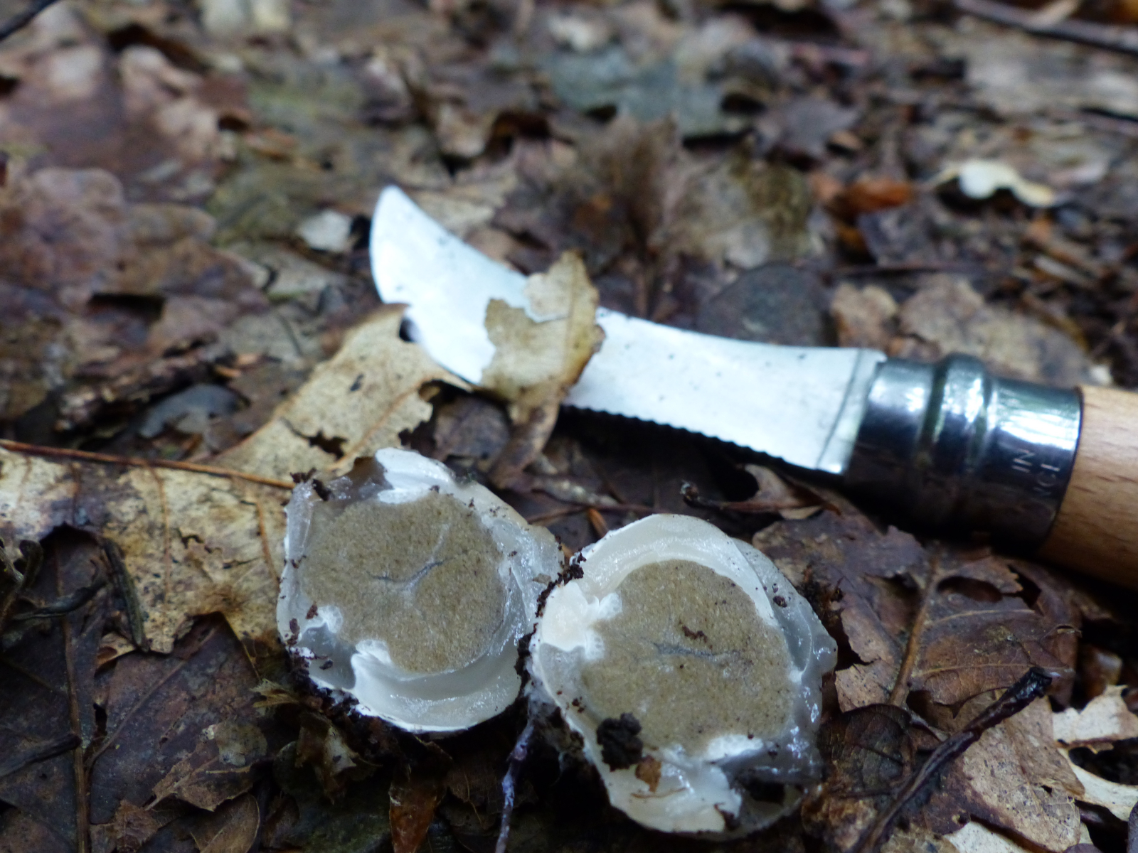 Es hatte etwa 3 cm Durchmesser und war unterbrochen ohne Haut. Wahrscheinlich schon der Reife gezollt, dass es so unterbrochen war. Unter der Haut ist eine durchsichtige Gallertmasse zu sehen. Der Faden war noch im Boden verankert.