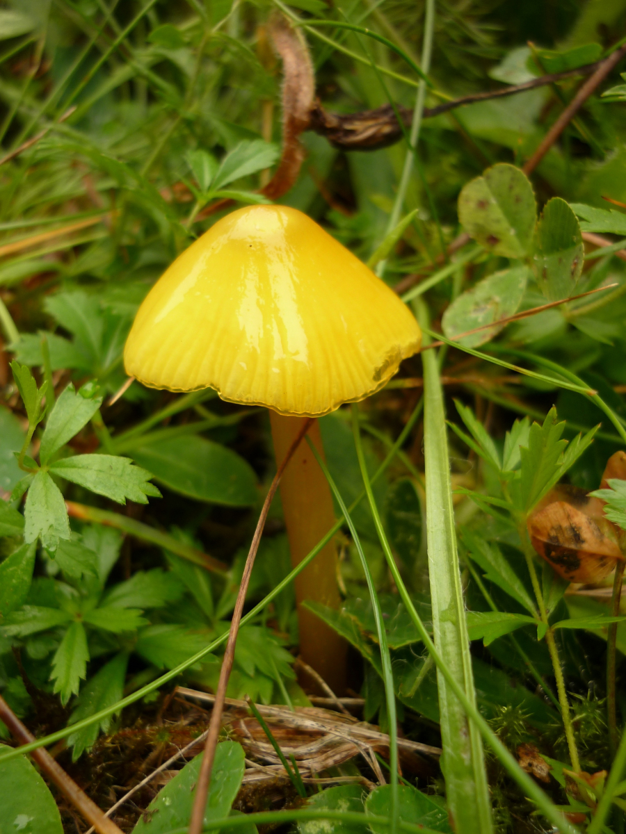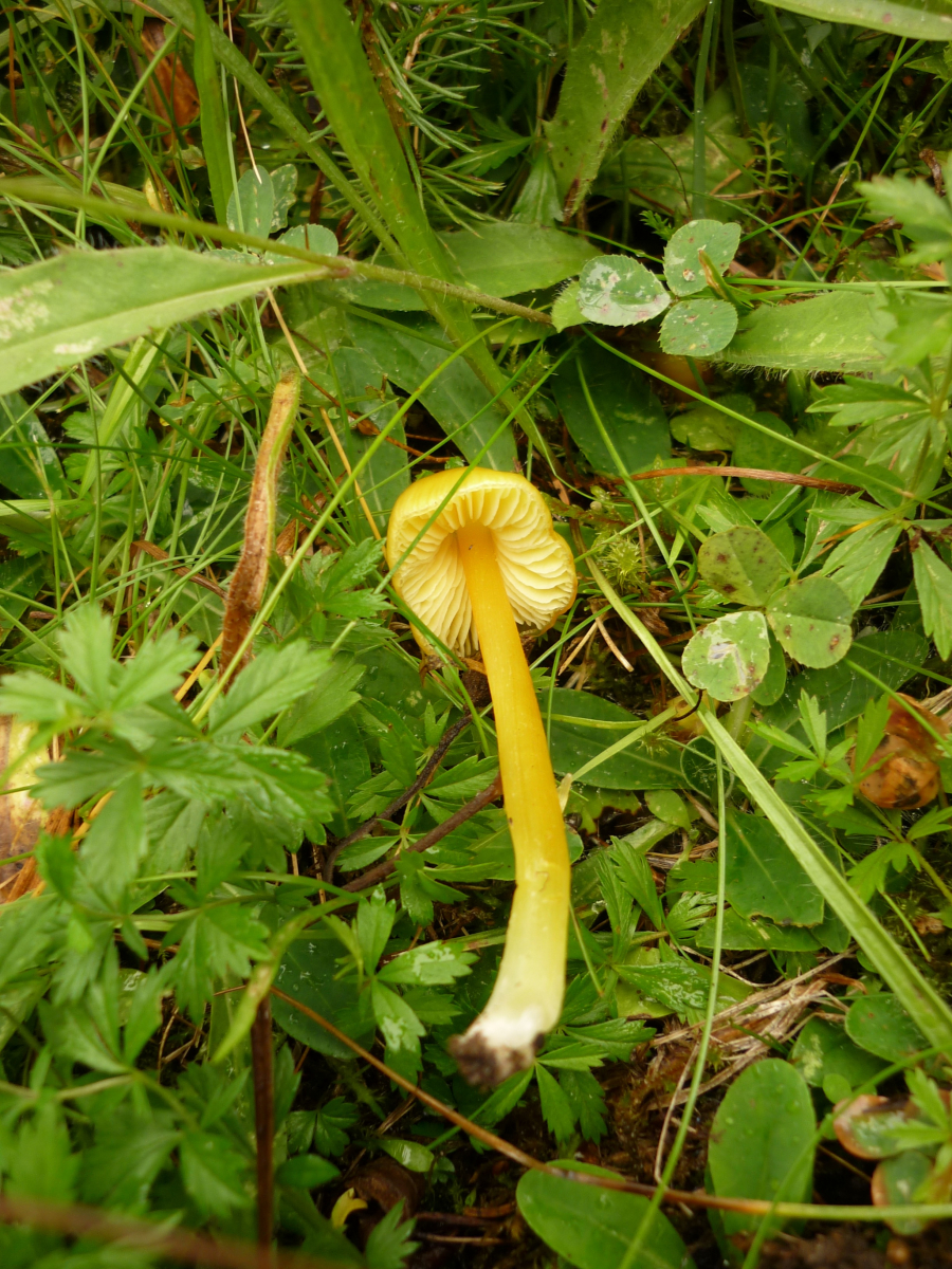 Den müsste man mal liegen lassen und gucken, ob er irgendwo schwarz anläuft (Lamellenschneiden, Bruchstellen vom Stiel usw.). Es gibt auch komplett gelbe Formen vom Schwärzenden Saftling (Hygrocybe conica). Tendenziell denke ich aber hier eher an den Stumpfen Saftling (Hygrocybe chlorophana) oder den Spitzgebuckelten Saftling (Hygrocybe persistens / acutoconica). Für letzten scheint aber der Hut nicht gebuckelt genug, für ersteren kommt mir der Hut zu glockig vor...