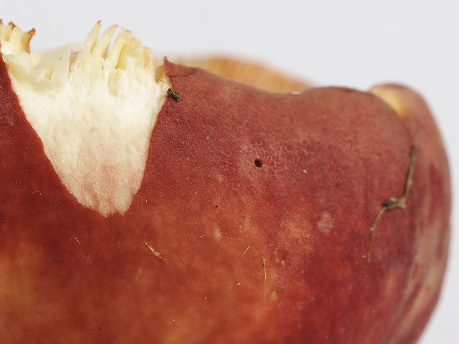 Hh teils rissig, rauh, kugelig, Rand glatt, eingerollt, Peeling 1/3, unter der Huthaut rötlich