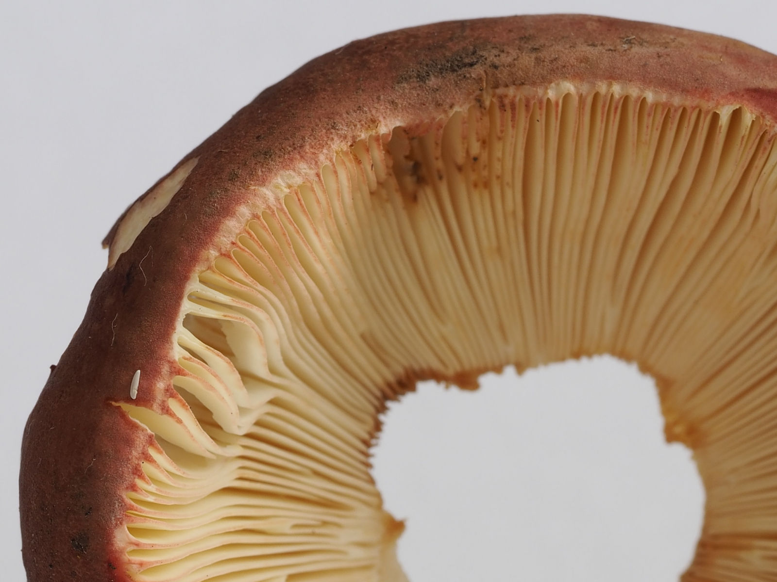 9) Lamellen bräunend, Bruch an der Stielspitze bräunend