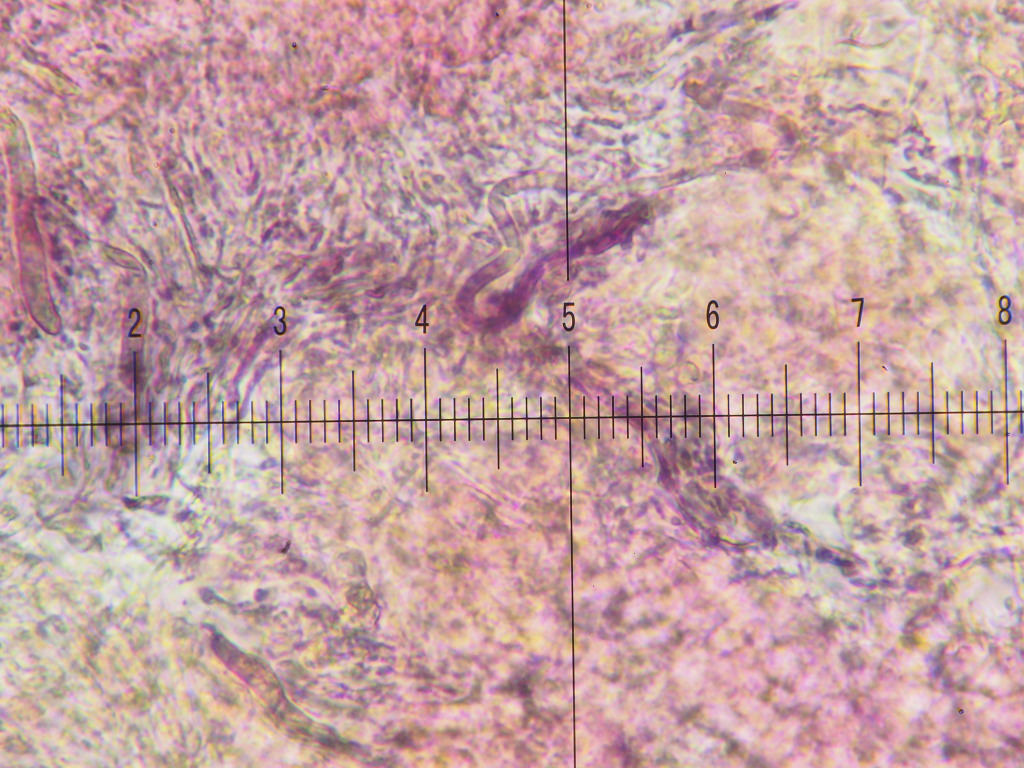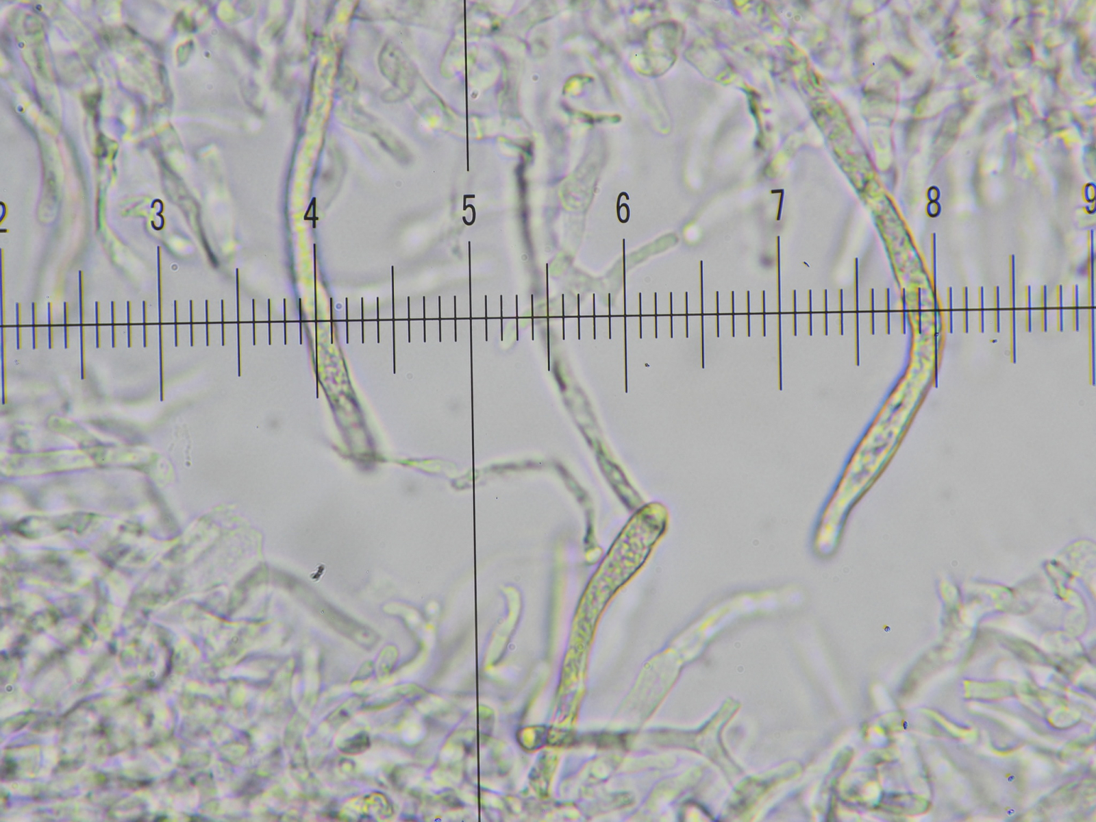 Es waren nur keulige, alles? unseptierte, teils lange Dermatozystiden auffindbar.