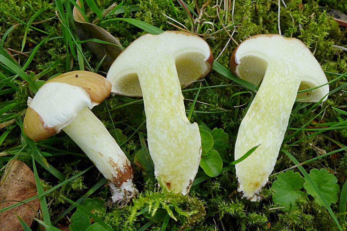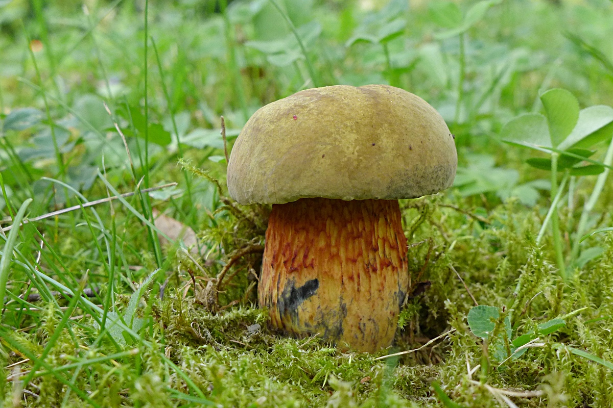 2 Meter weiter, immer noch bei Birken, winzige Netzhexen, Suillellus luridus, Syn. Boletus luridus, madig, trotzdem schön anzuschauen.