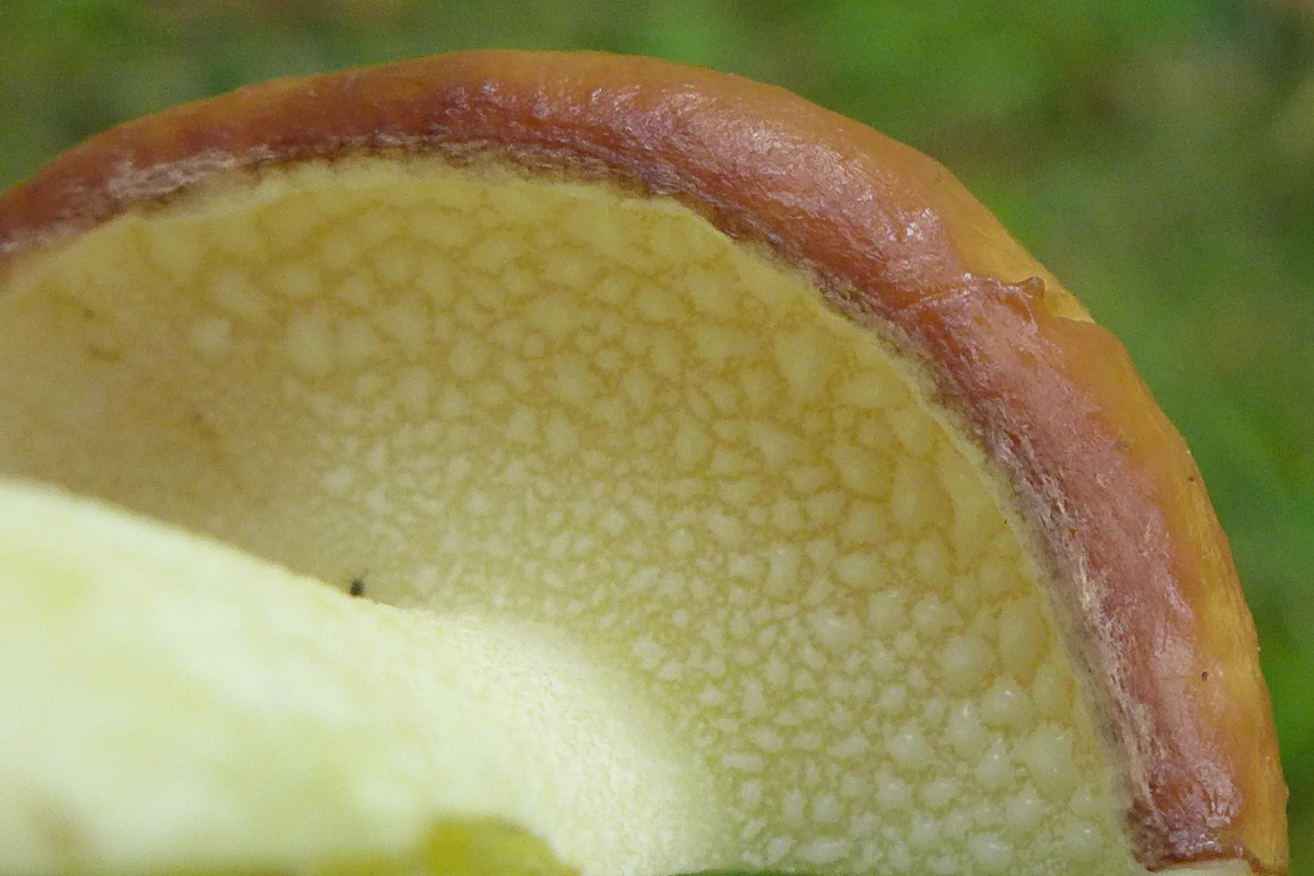 Aber jetzt kommt es: NIRGENDWO eine gelatinöse Schicht, die Huthaut lässt sich abziehen, aber kein bisschen dehnen, geht beim Zupfen sofort entzwei, darunter ist auch keine gelatinöse Schicht.... (hatte ich bei den bisherigen Funden eindeutig feststellen können).