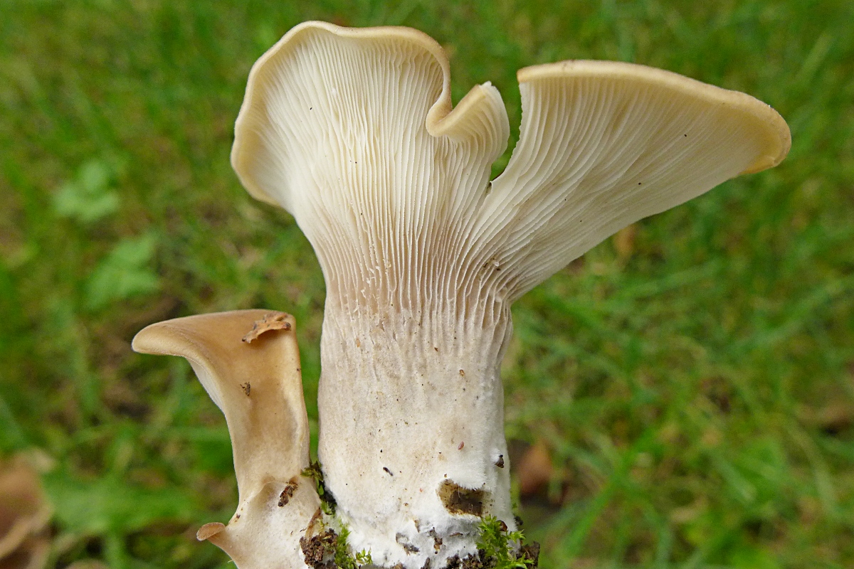 Highlight ... und ich dachte sofort an Hohenbuehelia petaloides/geogenia (und ich hatte schon mal Hohenbuehelia, einmal im Blumentopf - einmal im Wald, eher einzeln) sahen da etwas anders aus ... aber so wie hier habe ich mir die immer vorgestellt, stark büschelig auf Erdboden (möglicherweise alte Wurzeln da), Oberfläche, Lamellen, Farben, Geruch frisch gurkig-mehlig, Geschmack frisch gurkig-mehlig.