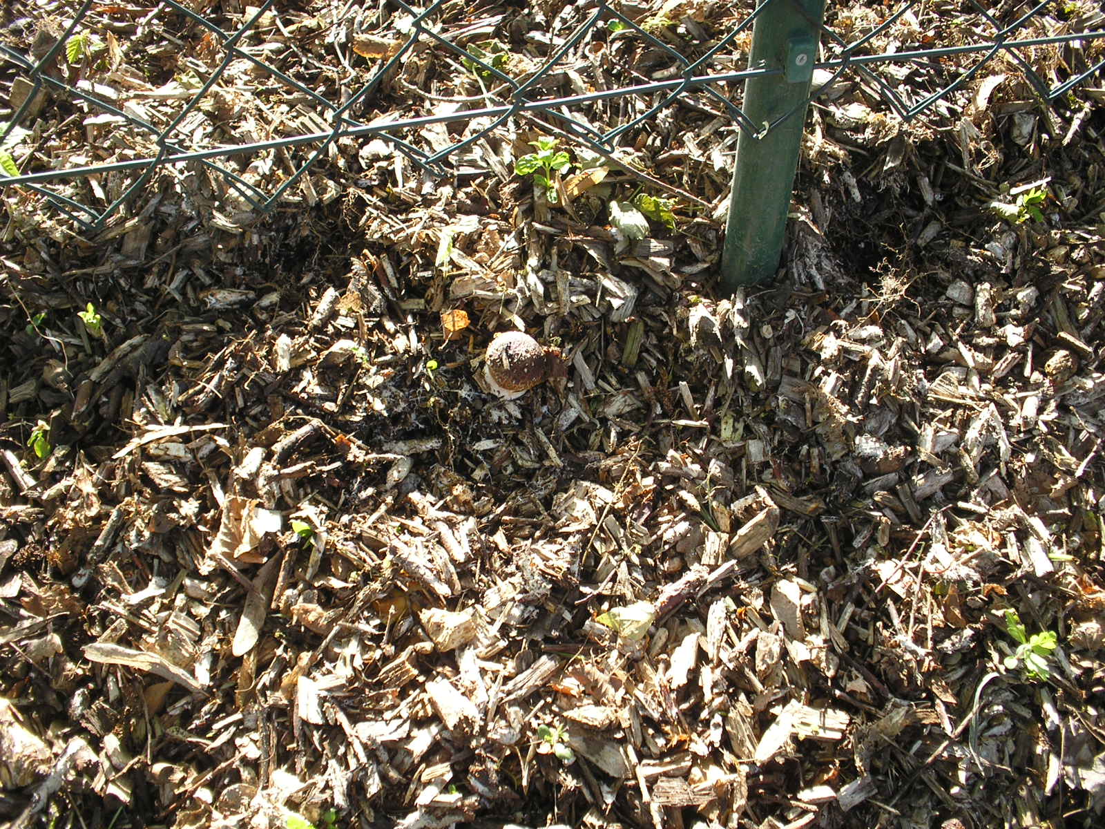 wenn man genauer hinschaut, sieht man Holzhäcksel und einen kleinen Pilz in der Bildmitte. Für eine Bestimmung müßte man aber noch ein paar Tage warten. Wenn dann auch Ring, Lamellen- und Sporenfarbe passen, könnte es schon ein Riesenträuschling sein.