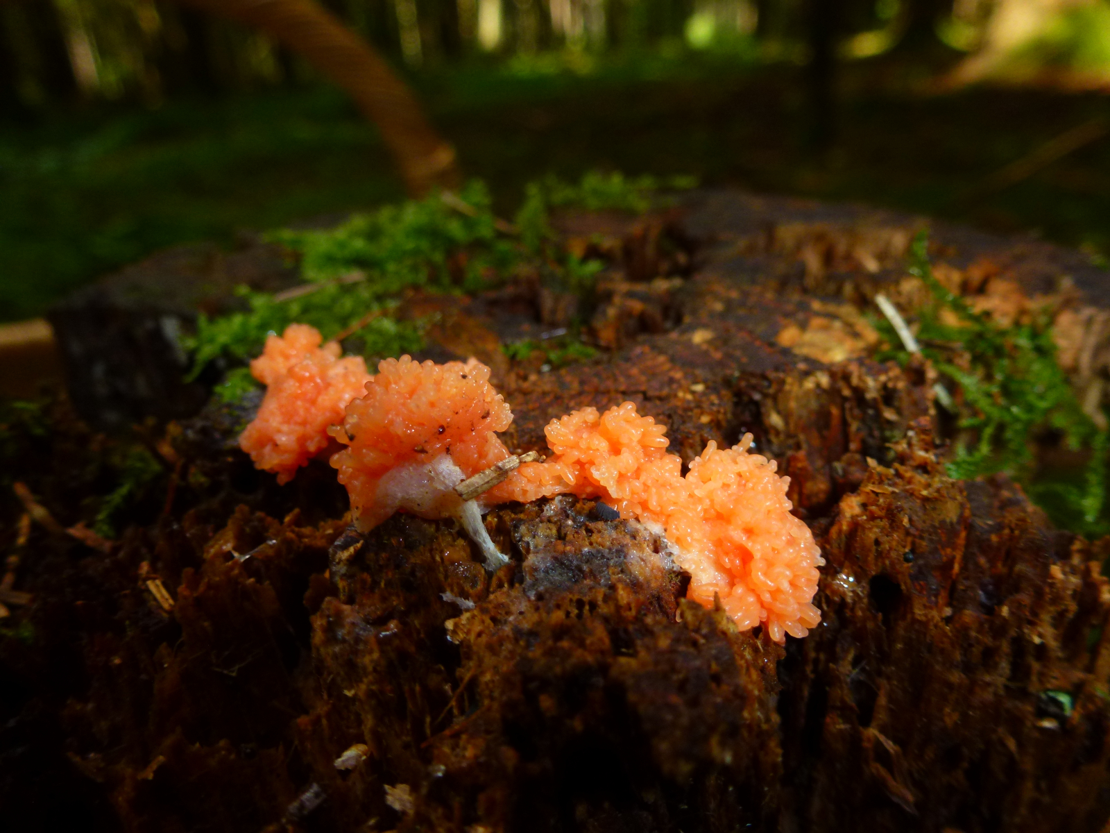 Als ich heute die ersten dieser Pilze entdeckte dachte ich von Weiten an Blutmilchpilzchen. Aus der Nähe war dann schon klar, dass es diese nicht sind. Aber ich quetschte die Pilze da ich eben in die Richtung der Schleimpilze dachte. Da gab es nichts zum quetschen - der Pilz ist gallertartig und keine Flüssigkeit trat aus. Ist dies bei dem Lachsfarbenen Schleimpilz so?