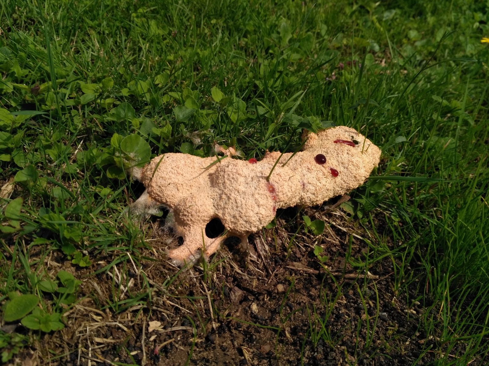 Zum Standort: Offensichtlich in der Wiese, an einer Stelle an der vorher etwa 10 Jahre eine alte Nadelbaumwurzel (unbekannt, evtl. Kiefer) stand, die vor etwa zwei Monaten weggefräst wurde. Das "Geschöpf" wuchs dort am Rand der beim Ausfräsen entstandenen Vertiefung.