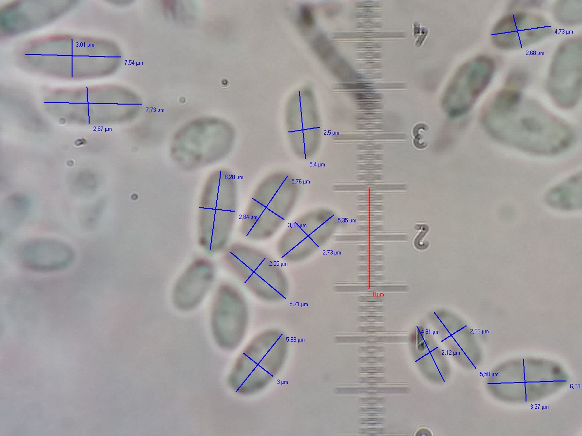 Das Hyphensystem war monomitisch, dünnwandig und mit fette Schnallen, dickwandige Subikulum Hyphen habe ich keine gesehen, ich habe aber auch nicht so genau geguckt. Basidien gab es 2 und 4 sporig und ich meine sogar einige einsporige Basidien gesehen zu haben, das war denke ich der Grund warum die Sporen sehr stark in die Größe unterscheiden.