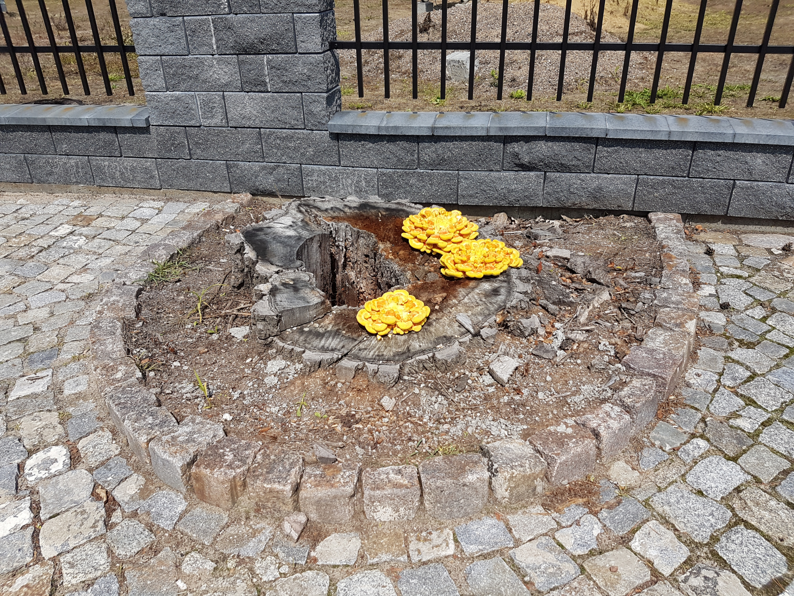 Ich war gerade im Garten unterwegs und wollte meine Grillecke für heute Abend vorbereiten, da ist mir auf einem gut zehn Jahre alten Baumstumpf ein orange-gelber Besucher aufgefallen. Ich bin mir grad nicht sicher, welche Baumart das mal war, so lange wohne ich noch nicht hier, ich weiß nur das einer der beiden Baumstümpfe mal ein Zwetschgenbaum (Pflaume) war. Dieser bunte Zeitgenosse teilt sich seine nähere Umgebung wie gesagt mit meinem Grill, unserem Holzvorrat und hinter der Mauer wächst alles mögliche in Nachbars Garten. Ich wollte ihn jetzt noch nicht unbedingt dort entfernen, deswegen hoffe ich die obigen Infos und die Bilder reichen erst mal aus. Ich kenne mich in der Welt der Pilze zwar noch nicht wirklich gut aus, aber wenn meine Recherchen im Internetz richtig waren dürfte es sich vermutlich um einen Gemeinen Schwefelporling handeln?