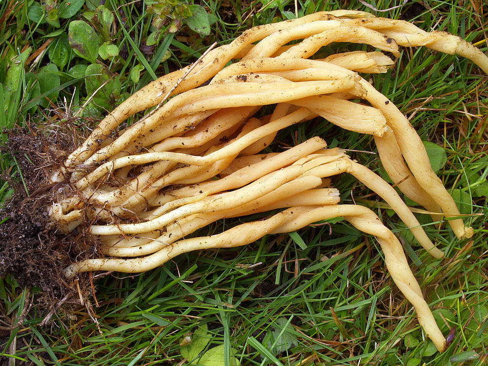 Erst erfreuten wir uns der Wuchsfreude erster Saftlinge und dann auf einmal dieser Erstfund dort. Erst eine einzelne Stelle mit der Wiesenkeule von relativ dünner Statur, doch dann immer weitere und immer dicker werdende Fruchtkörper. Noch nie war dieser Pilz mir dort begegnet. :cool: