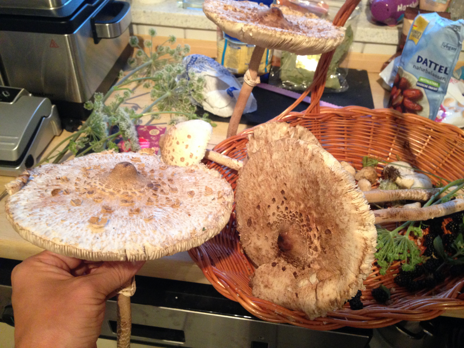 Mit diesem Nippel auf der Mitte (Brustwarze) handelt es sich wohl um den Zitzen-Riesenschirmling Macrolepiota mastoidea , aber die abgebildeten Exemplare sehe ich wegen den schon abgeflachten Hüten , schon am Rand hochgebogen , als zu alt für eine sinnvolle kulinarische Verwendung an.