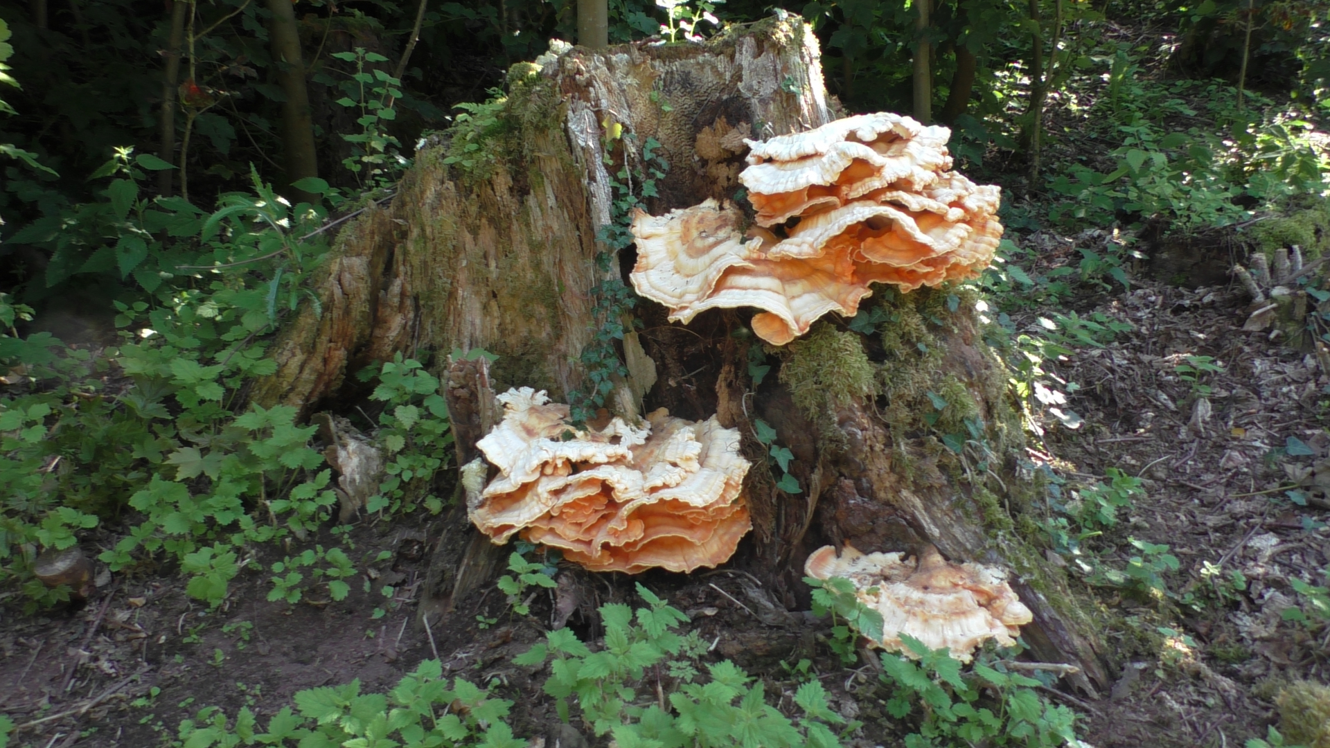 Und ein Schwefelporling, den ich bereits letzte Woche gesichtet hatte, ist mittlerweile zu beachtlicher Größe angewachsen.