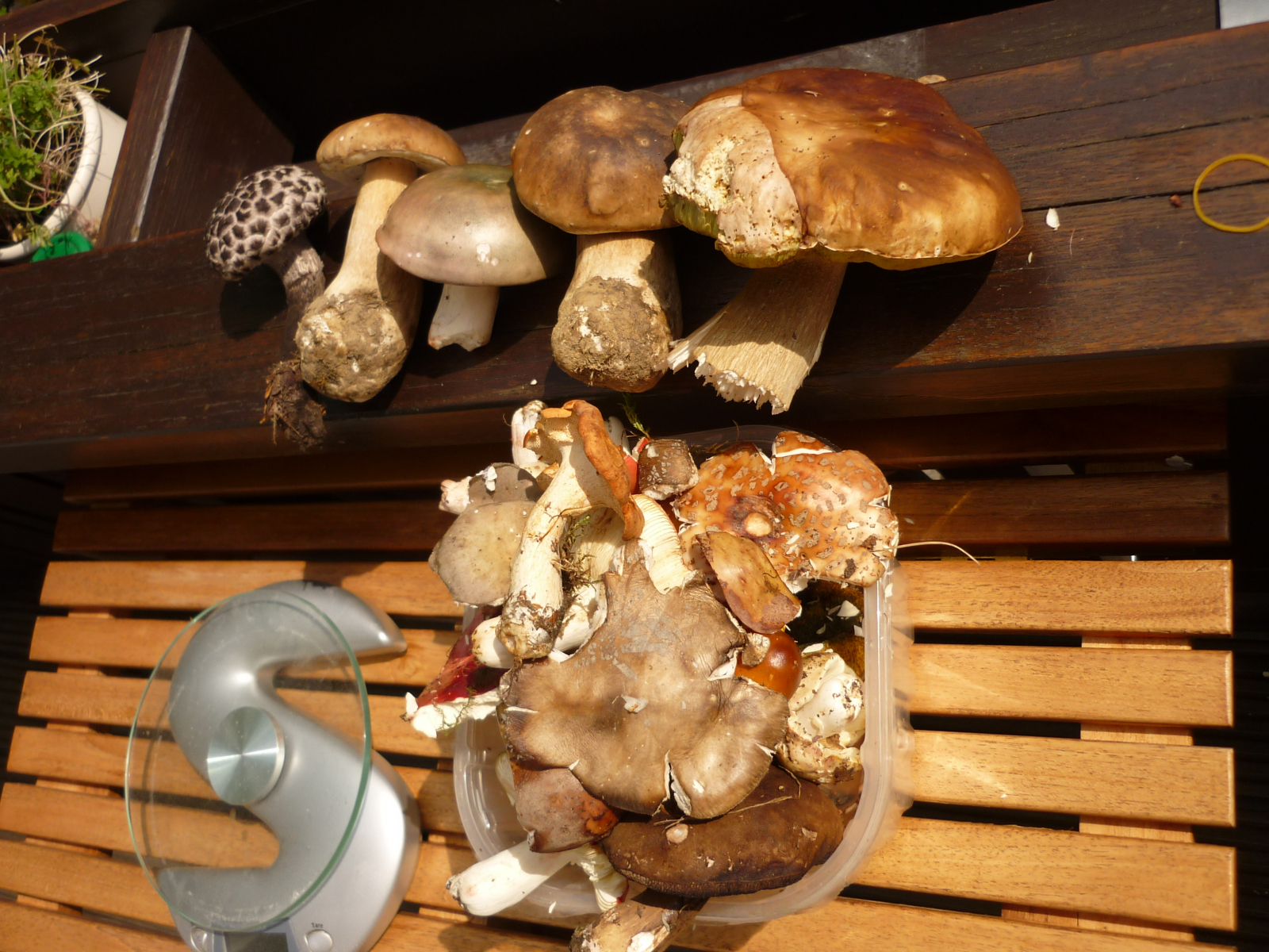 Ich habe fix Pilze gesammelt, Täublinge, Steinpilze, Perlis und Rotfüße. Es hat eine Weile nicht geregnet, deshalb waren alle waren sehr trocken, die meisten madig.