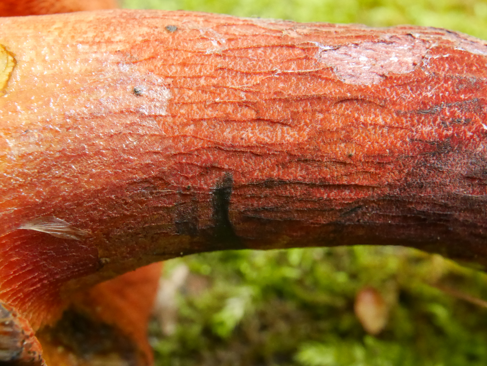 Der Stiel mutete beim flüchtigen Hinsehen eher flockig an, in den Nahaufnahmen ist jedoch deutlich eine Netzstruktur zu sehen, die allerdings im oberen Drittel des Stieles schwächer wurde und in eine flockige Struktur überging. Die wenigen Netzstieligen Hexenröhrlinge, die ich bisher gesehen habe, hatten ein deutlich ausgeprägteres Netz.