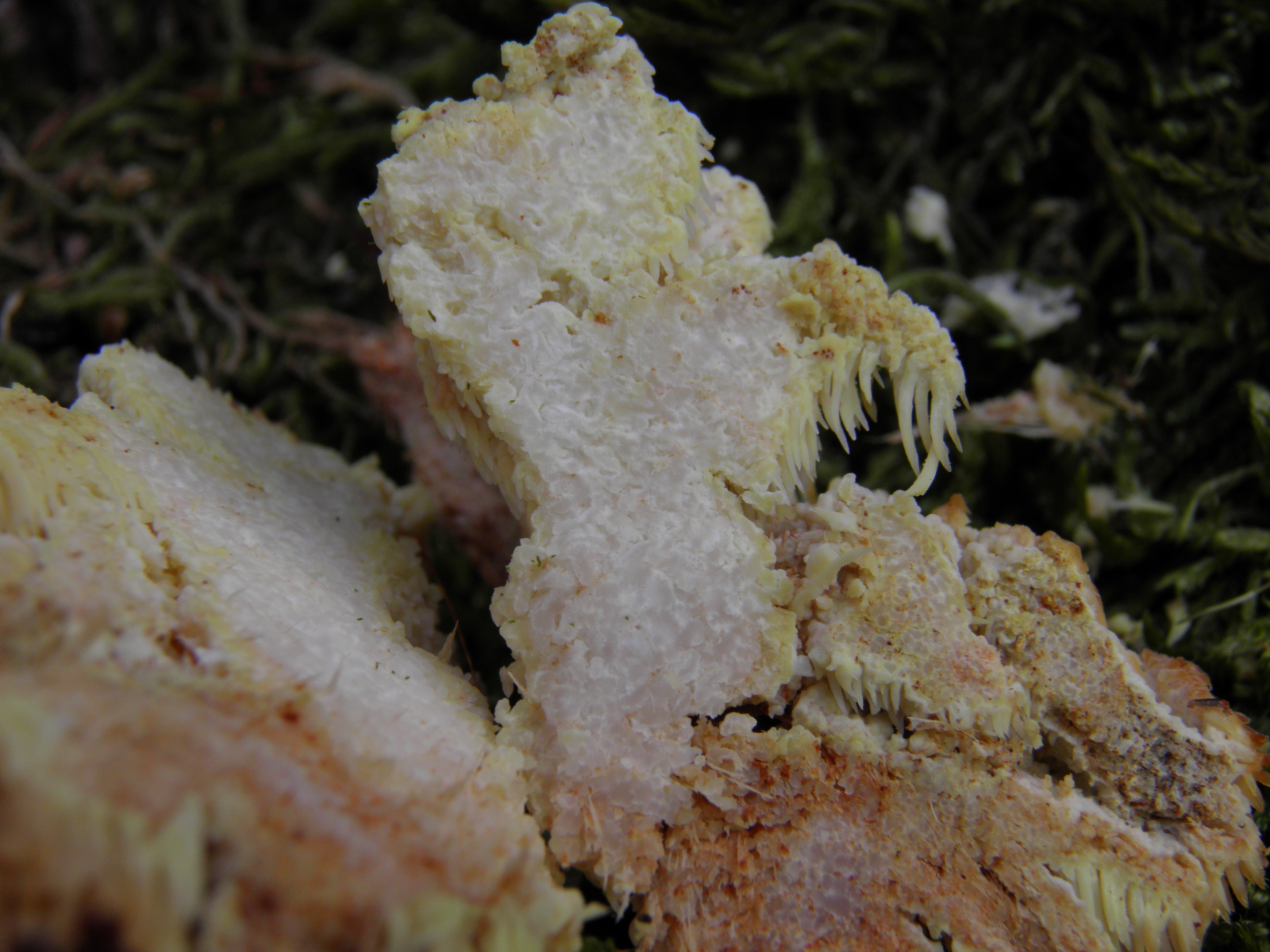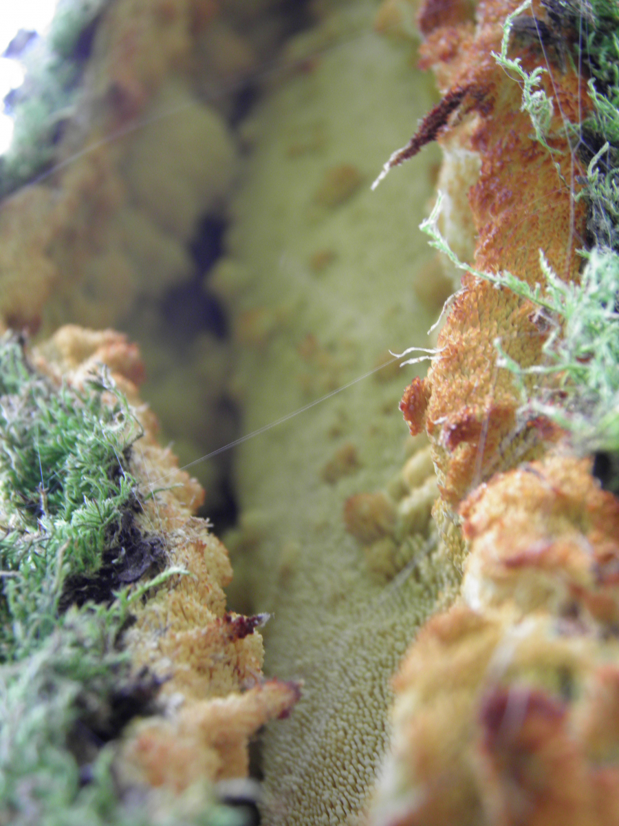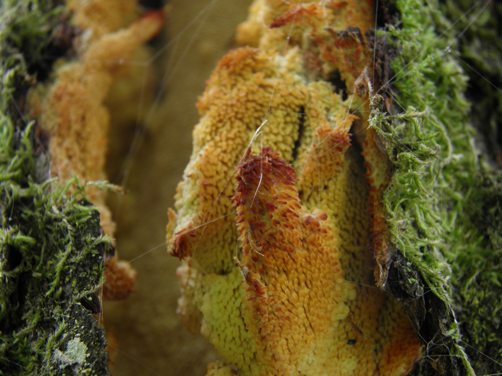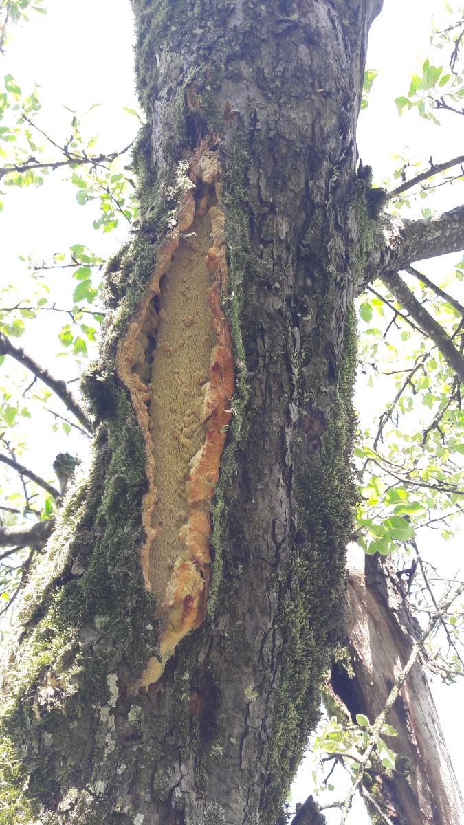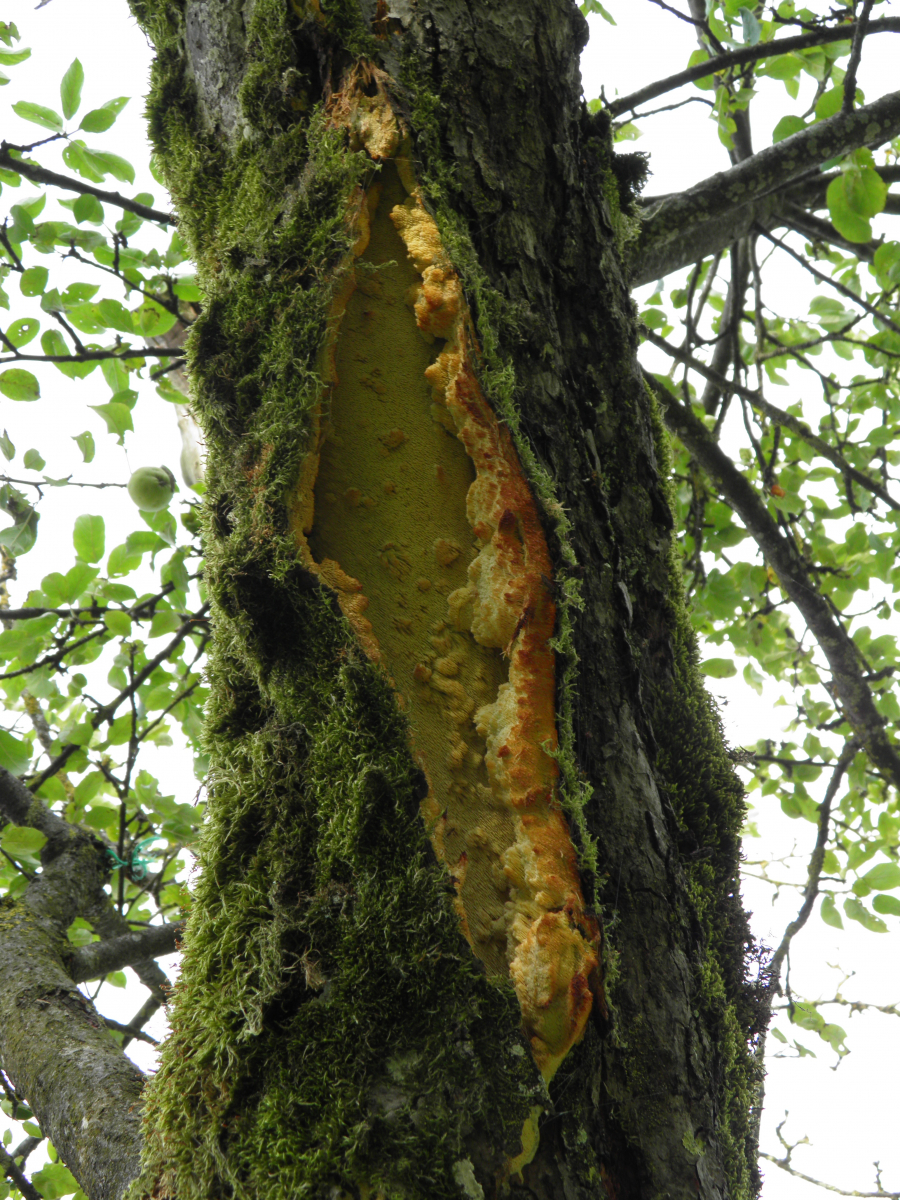 und juhuu er ist wieder gekommen. an einem "halbtoten" apfelbaum in nachbars streuobstwiese ist wie letztes jahr vermutlich ein apfelbaumstachelbart -Sarcodontia Setosa- gewachsen (damals von pablo so angesprochen). an einem noch lebenden ast ist er über eine länge von gut einem halben meter unter der rinde "hervorgebrochen". der im letzten jahr befallene ast ist abgestorben und zeigt heuer kein pilzwachstum mehr.
