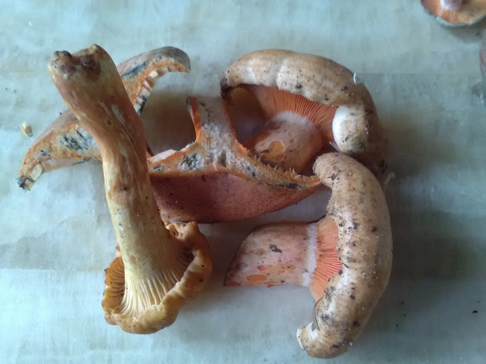 Dann 2 Reizker. Lactarius deliciosus und Lactarius semisanguifluus wären gute Möglichkeiten; allerdings müssten am Fundort auch Kiefern gestanden haben und ich hätte zur letzten Absicherung auch gerne mal von beiden Arten die Stieloberfläche gesehen.l.g.