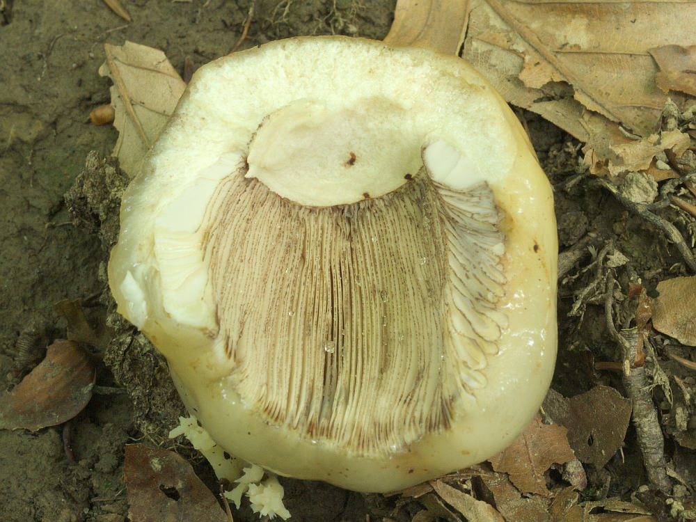 Blassere Hutfarben besonders im Zentrum, weicheres zerbrechliches Fleisch, milden oder allenfalls schwach bitteren Geschmack und blass cremefarbenes Sporenpulver hat der
