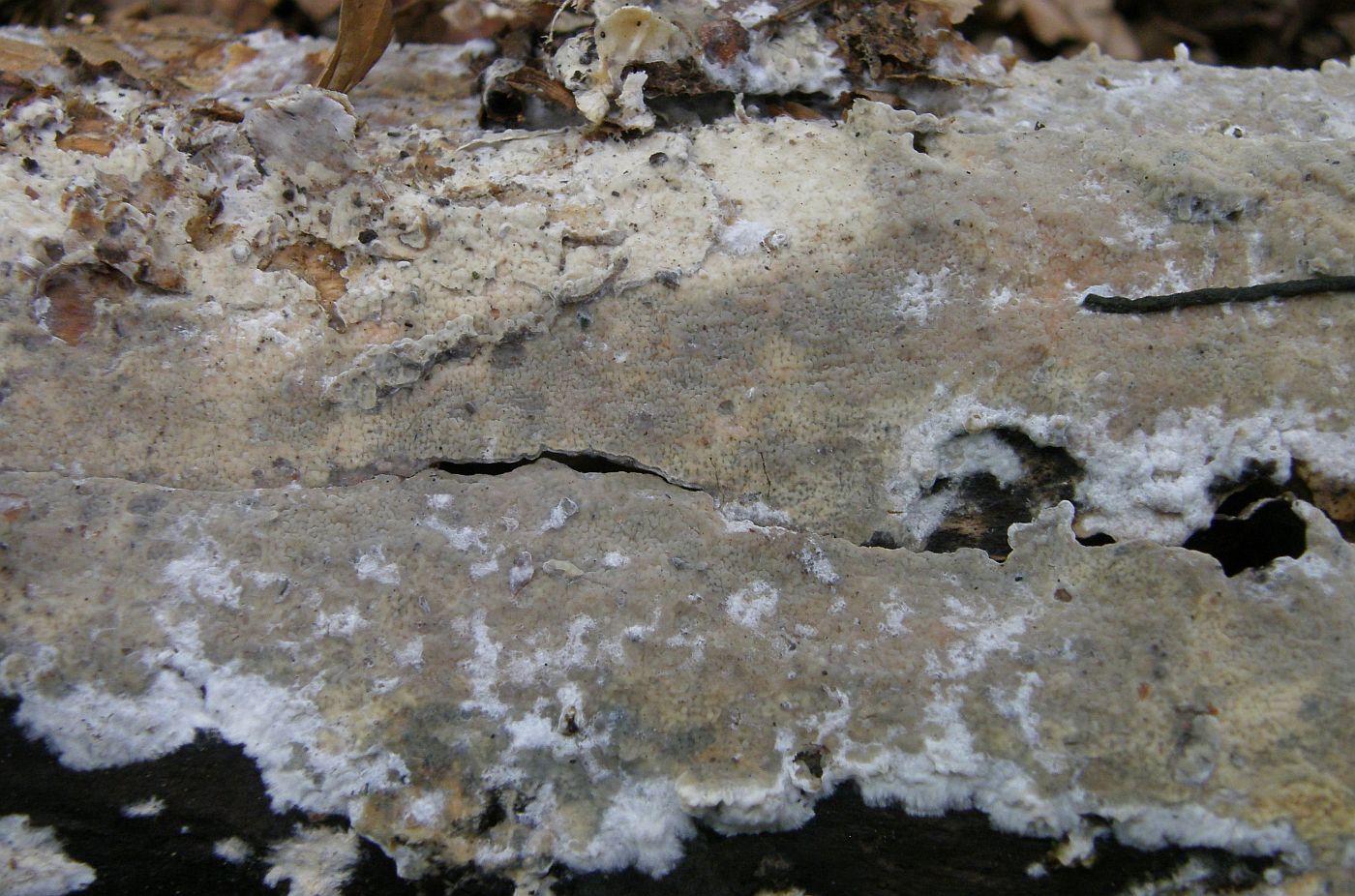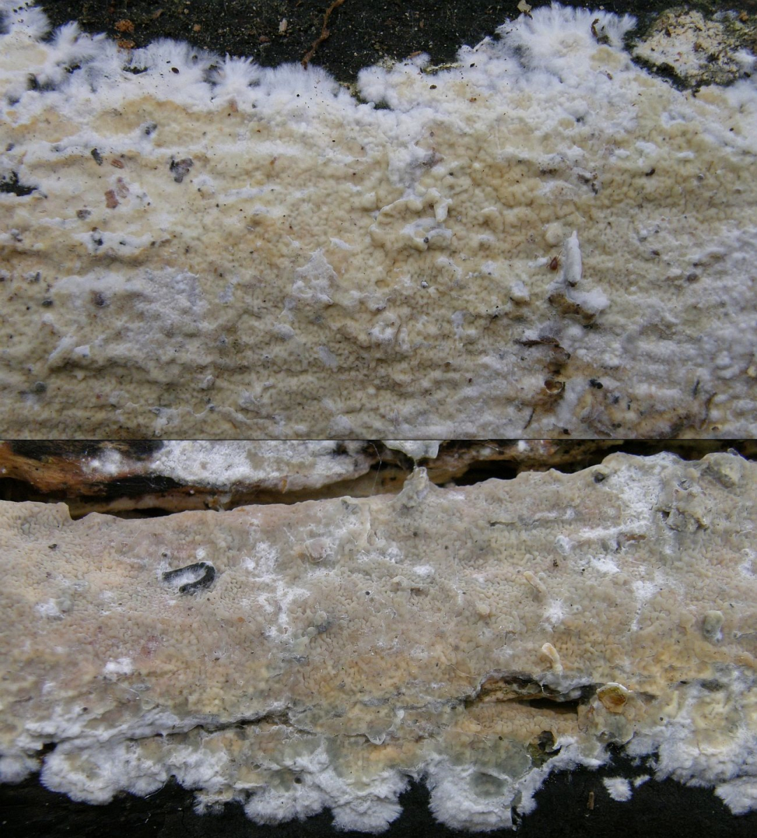 >Phlebia radiata< kann auch mal blass gefärbt sein, geht dann aber zumindest in teilen der Fruchtkörper deutlich ins violette oder violettbraune und hat eine andere Struktur des Hymeniums.