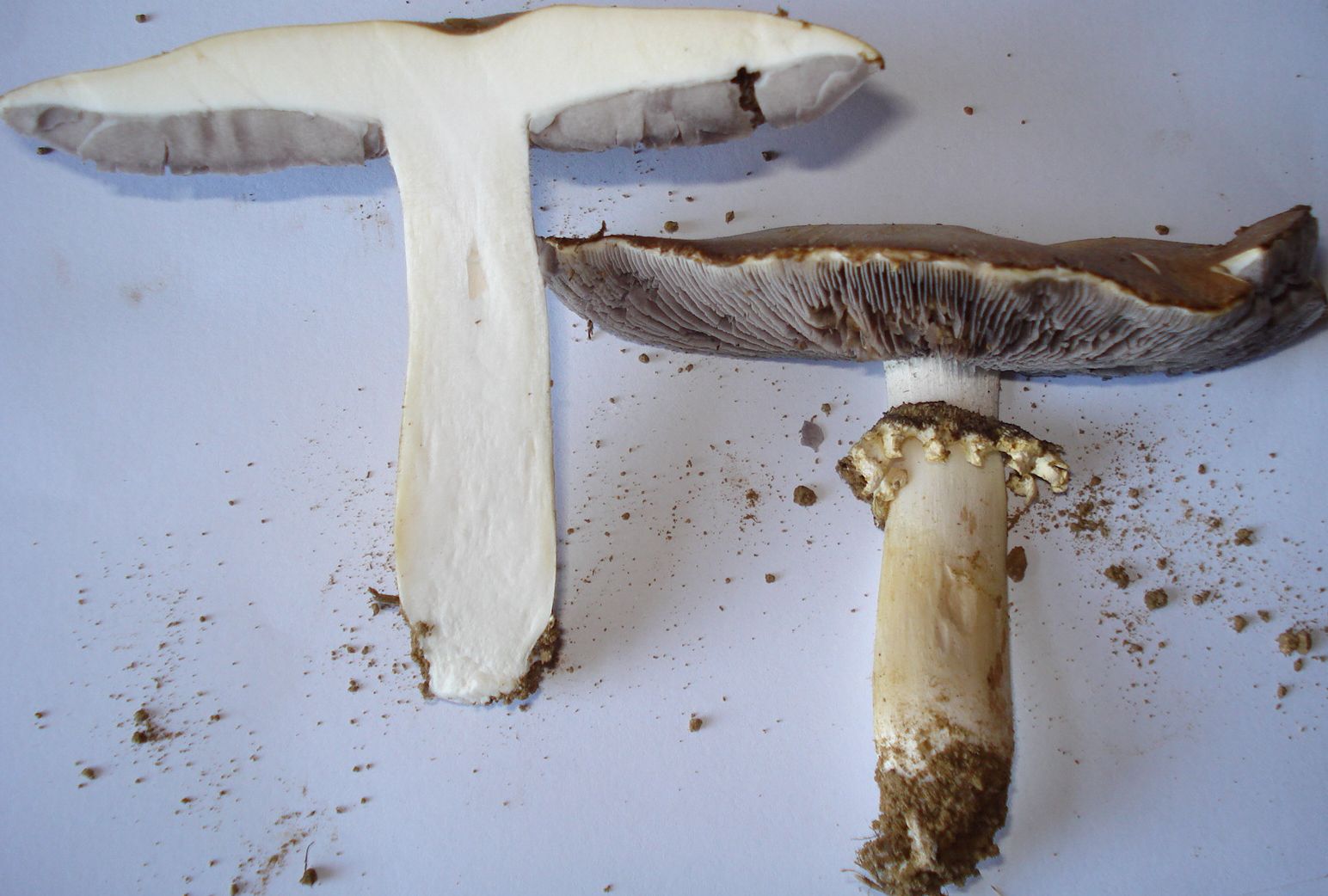 Keiner in meiem Buch hat eine so dunkele Kappe. Die lamellen wirken fast violett, sind am Stielanstz frei. Nach dem aufschneiden etwa nach einer Stunde leicht nachgelbend. Die Hüte 8-14cm im Durchmesser Die Huthaut leichtabtrennbar. Der Pilhöhe ca 8-10cm. Sehr duckles fast violette/schwarzes Sporenpulver. Geruch wie Champignon. Auffällige Form des Rings bei dem jüngeren Pilz. Ein etwas älters Exemplar war heller in der bräunlichen Färbubg geworden. Fundort auf einem Getreidefeld, leider konnte ich diesen nicht Bestimmen. Etwa 8-10 einzeln stehende Pilze auf 25qm.