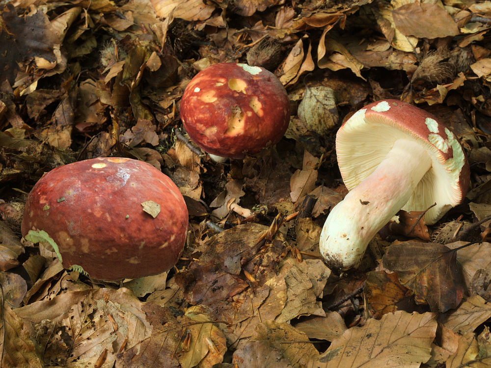Unter der Schar von sehr scharfen, roten Täublingen mit fast weißem Sporenpulver entpuppte sich eine Gruppe mit erträglicher Schärfe unter Eiche, als Cremesporer.