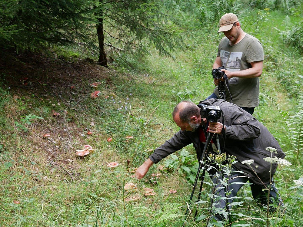 Zum Abschluss ging es noch zu einem bekannten Standort wo wir einen Täubling zu finden hofften, den Felix noch nicht selbst gefunden hatte. Der Täublingswahnsinn fand ein unglaubliches Ende. Mehr als 100 Fruchtkörper an einer Böschung unter einer Birke, die selbst mit Weitwinkel nicht zu erfassen gewesen wären