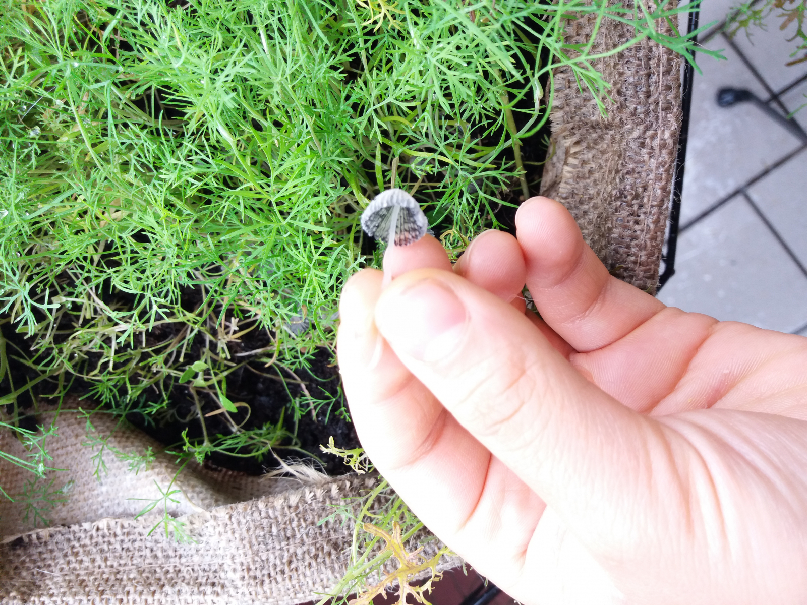ich habe heute eine kleine Entdeckung zwischen meinem Dill (und dem Mizuna was da nicht sein sollte), welches im Jutesack auf dem Balkon hängt, gemacht.