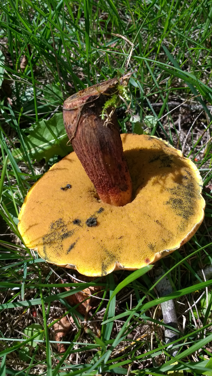 Es fällt mir schwer diesen Pilz zu bestimmen. Der Hut ist eher hellbraun .. die Röhren gelblich bis teilweise rot.