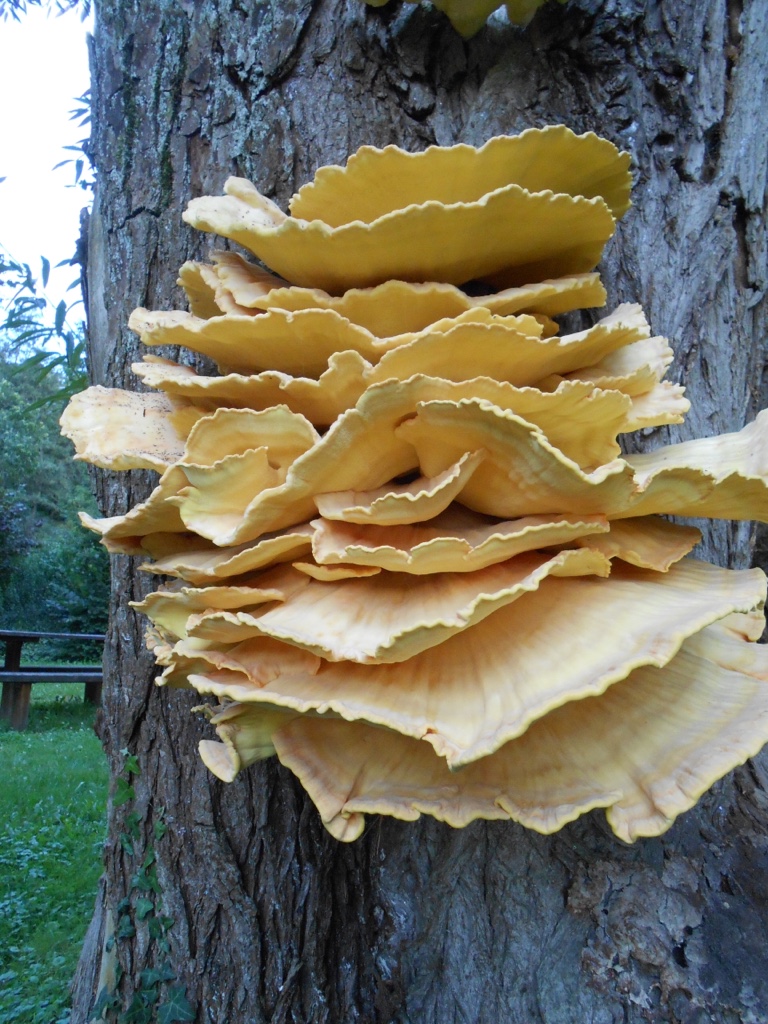 Ich fuhr eine Straße in meiner Heimatstadt Wetzlar entlang, und da sah ich ihn schon von weitem hellgelb leuchten! Schaut euch mal die Bilder von diesem mĂ€chtigen, wunderschön gelb-samtig-sonnigen Riesen-Mega-Schwefelporling (Laetiporus sulphureus) an! :sun: Denn als solchen habe ich ihn erst mal bestimmt.