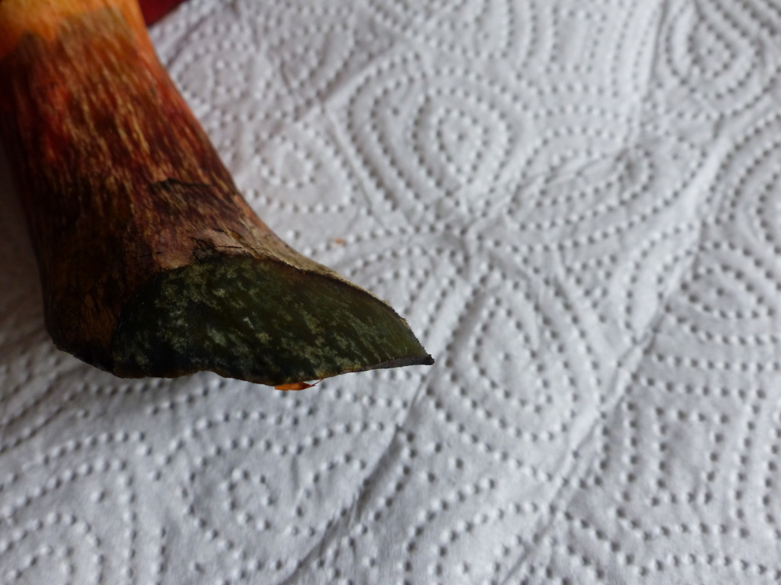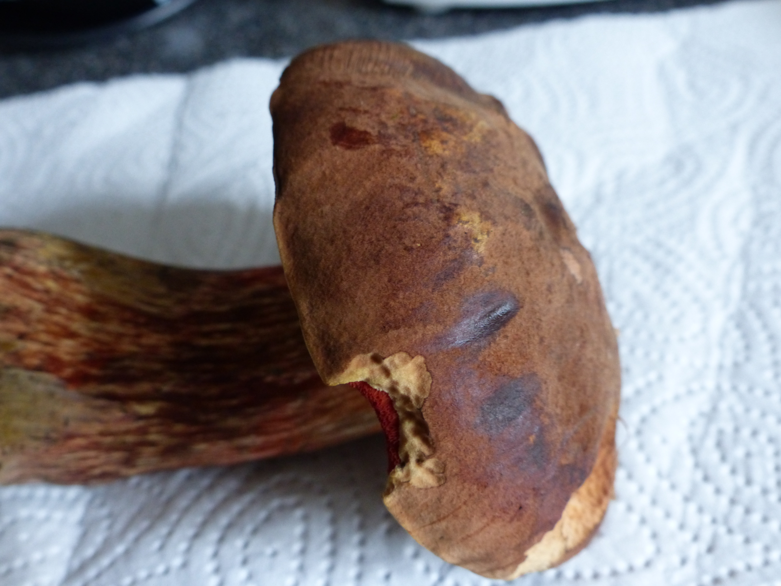 Stiel: etwa 8-10 cm hoch, fasrig gemustert in rot und braun,