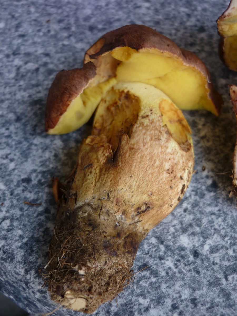 Letztjährige Fund , Geschmack Nuss , Stielbasis rötlich , bei schnitt kaum blauen und nach eigene zeit verliert blau Farbe .