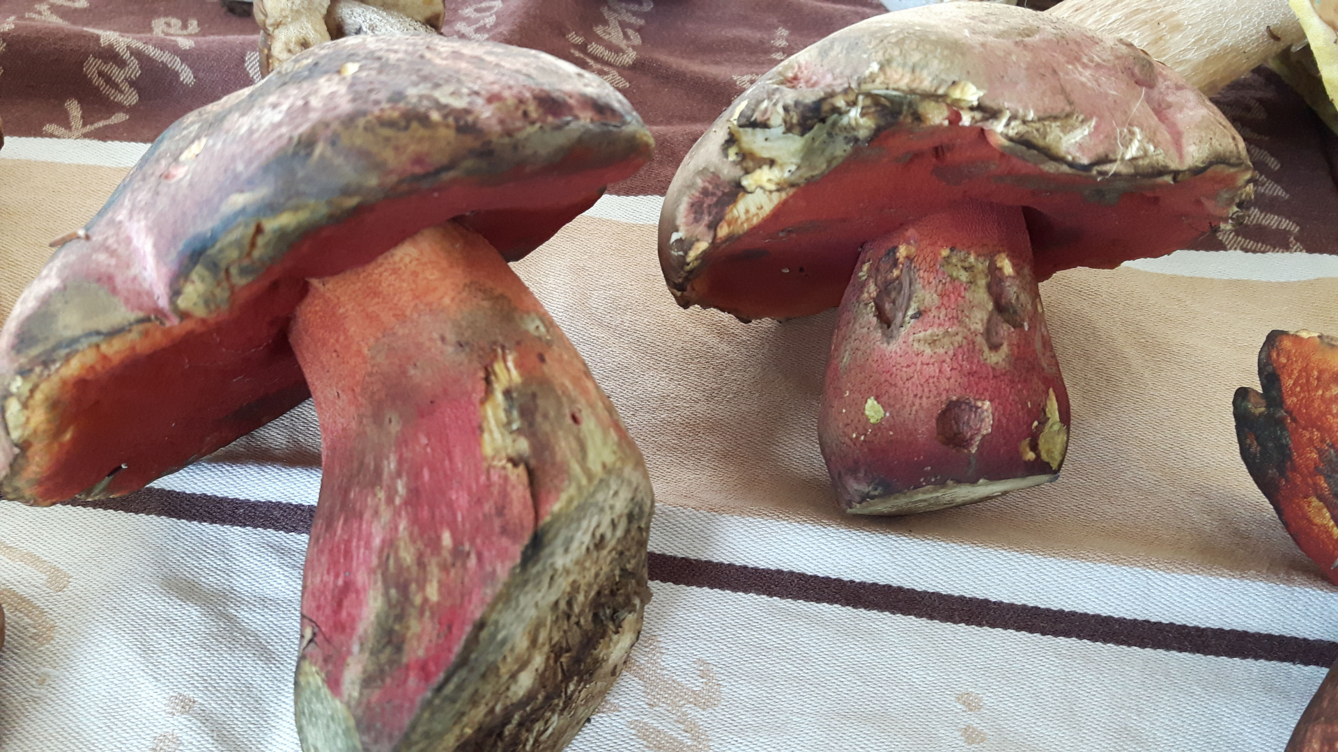 der Satanspilz kann durchaus rosa auf dem Hut. Ich sehe am Stiel, jeweils in der unteren Hälfte, das typische, Richtung pink gehende Satanspilz-Rot. Boletus rubrosanguineus, den ich zu sehen auch schon ein paar mal das Vergnügen hatte, hat ein mehr blutiges Rot. Und für Boletus rhodoxanthus ist mir das Gelb des Fleisches zu wenig leuchtend, das wäre schon fast wie beim Flockie.