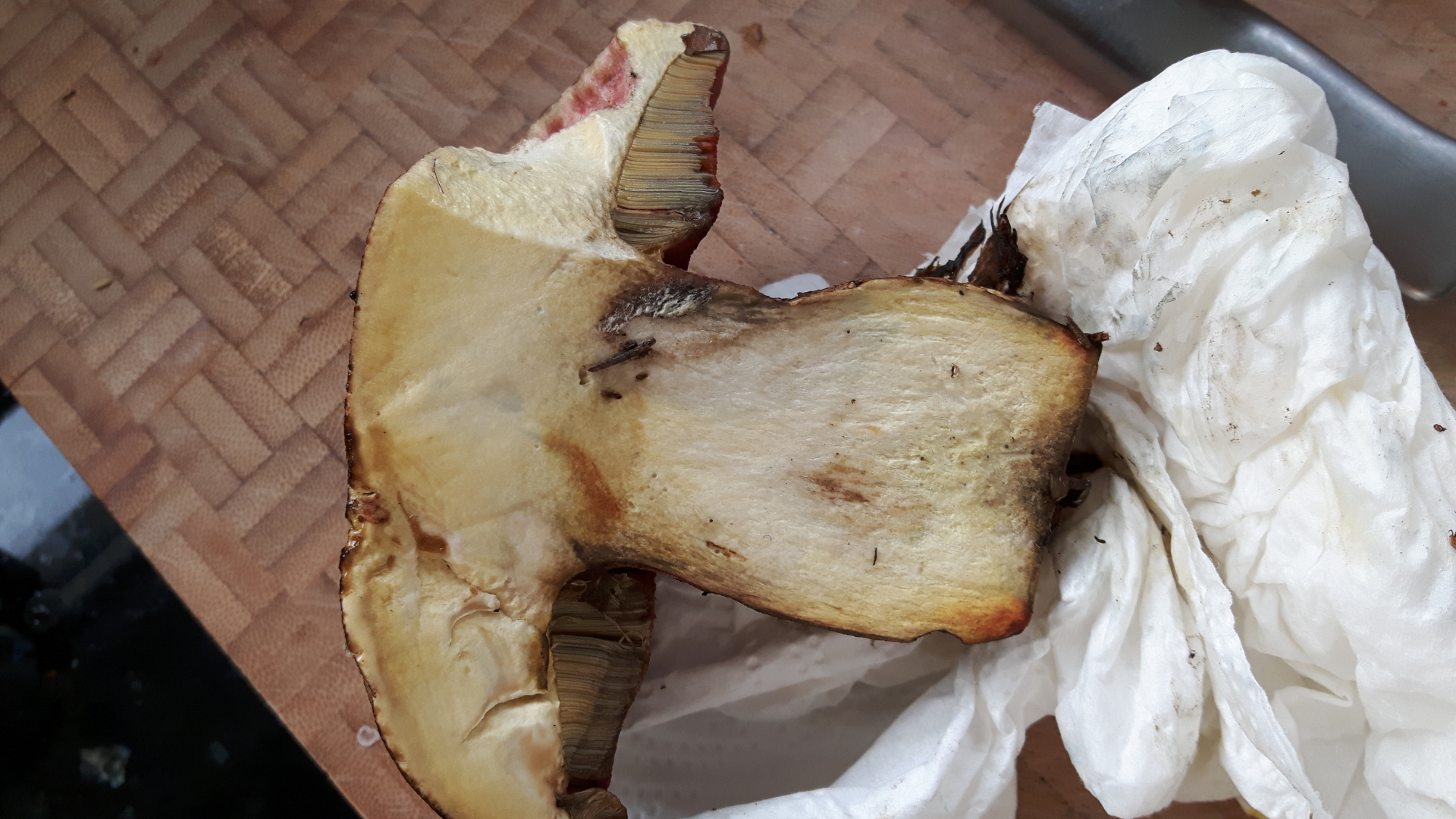 Bei unbekannten Bestimmlingen bitte immer den ganzen Fruchtkörper ansehen / zeigen und nicht die Stielbasis wegschneiden. Dann bitte immer einen Schnitt durchs Fleisch zeigen (bis in die Stielbasis) und bitte auch zeigen, wie er am Hut auf Berührung reagiert (bei großen Röhrlingen).