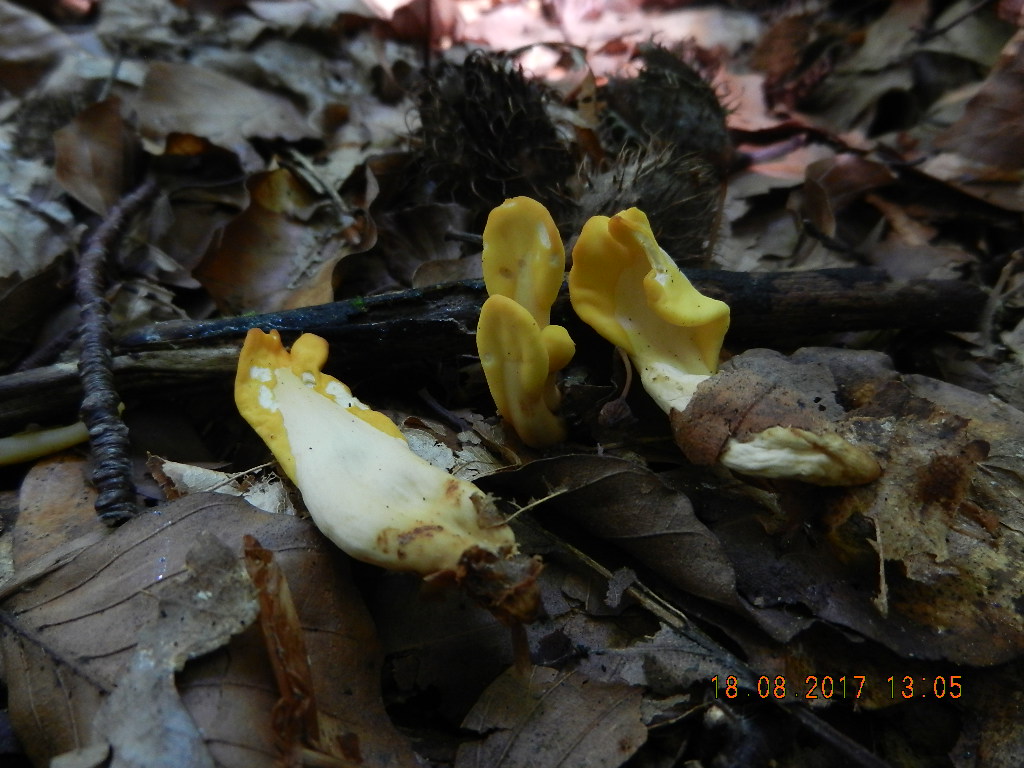 Spathularia flava (Dottergelber Spateling); in meinen Pilzbüchern steht Nadelwald, aber der kann offensichtlich auch Laubwald