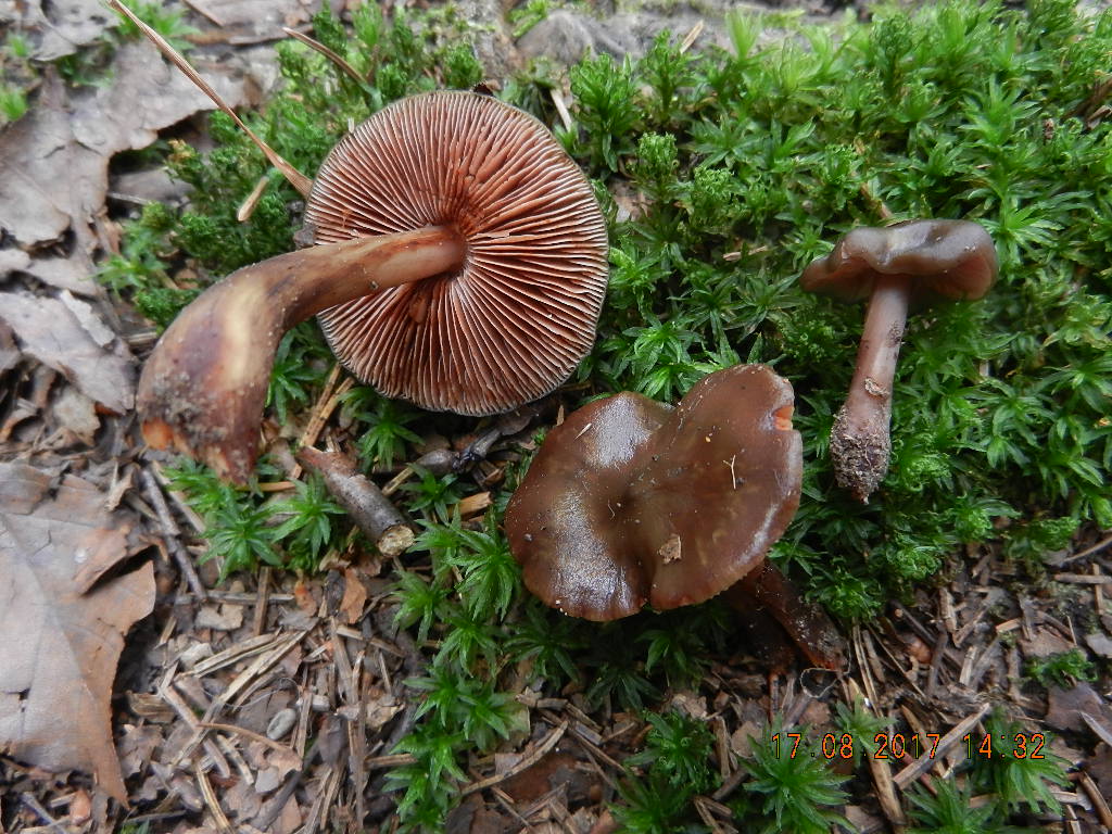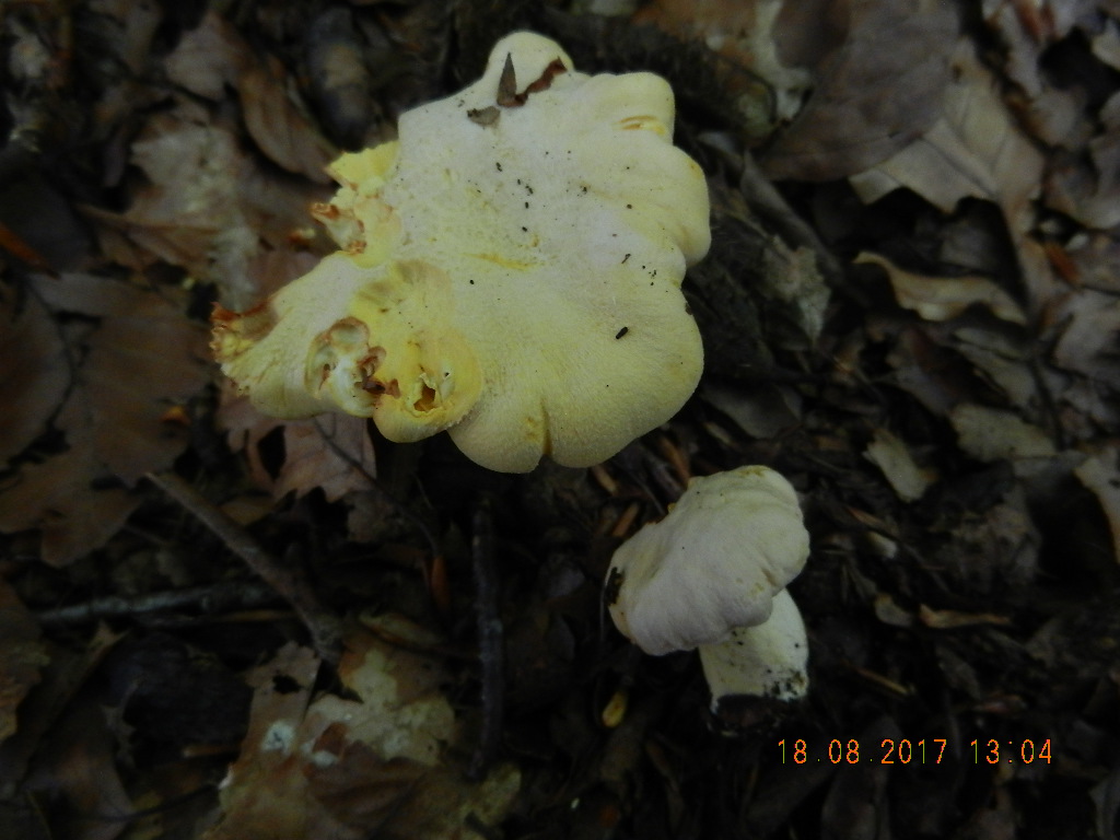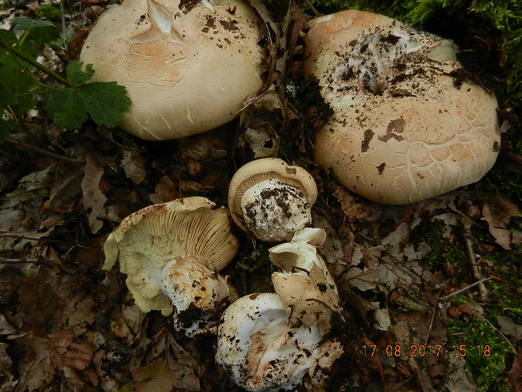 dieser fiel mir schon am Parkplatz quasi entgegen: Leucopaxillus tricolor (Dreifarbiger Krempentrichterling), den ich vor Jahren erst mal mit Tricholoma acerbum verwechselt hatte, bis mir ein Forums-Helferlein den richtigen Weg wies - na ja, immerhin kann ich mir Pilze gut merken, wenn auch nicht immer gut bestimmen...