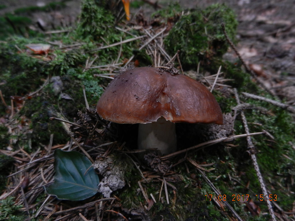 dann noch von der Waldenburger Ebene, der Wieseltäubling. Den bestimmt man normalerweise so: erst rennt man hin, weil man meint, einen Steinpilz vor sich zu haben, dann nimmt man ihn auf, dreht ihn um und stellt fest, dass er weiße Lamellen hat - das ist gefühlt immer der Wieseltäubling: