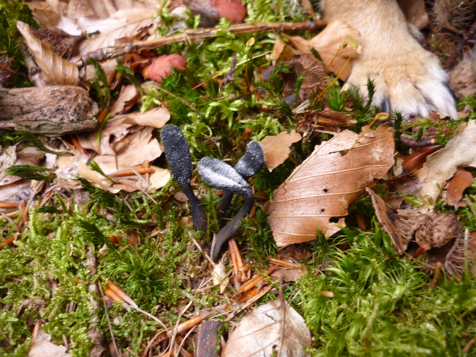 Da ich durch das Pilzrätsel gelernt hatte, dass die Zungenkernkeule über der Hirschrüffel wächst und mit ihr verbunden ist, beschloss ich, mit schwerem Gerät wiederzukommen. Ganz taufrisch waren die Pilzlein leider nicht mehr, als ich heute eintraf.