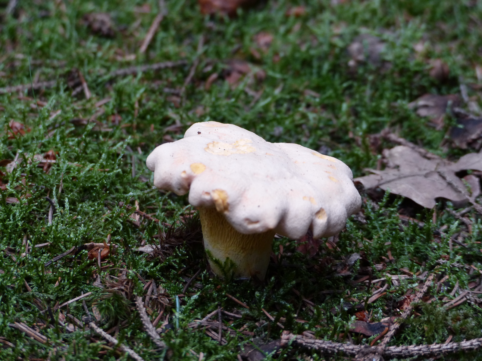 Hut: hell,-dottergelb, wellig, etwa 8-10 cm Durchmesser, vollfleischig, wie mit Reif überzogen,