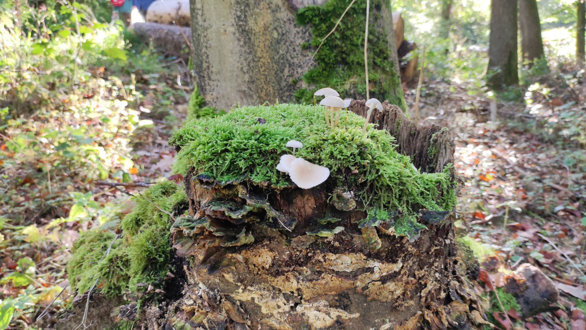 Ein GrĂźppchen "kleiner Pilze" auf einem verrottenden Baumstamm. Bestimmen konnte ich sie nicht. Unten dran noch ebenfalls verrottende Reste irgendwelcher Schichtpilze oder Trameten.