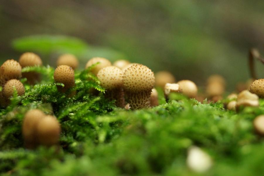 Bei dem ersten dachte ich an eine Art Lycoperdon, aber so kleine Exemplare kenne ich nicht. Der Pilz ist auf einem alten Erlenstumpf gewachsen.