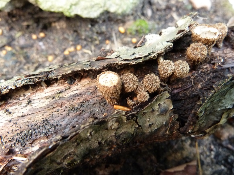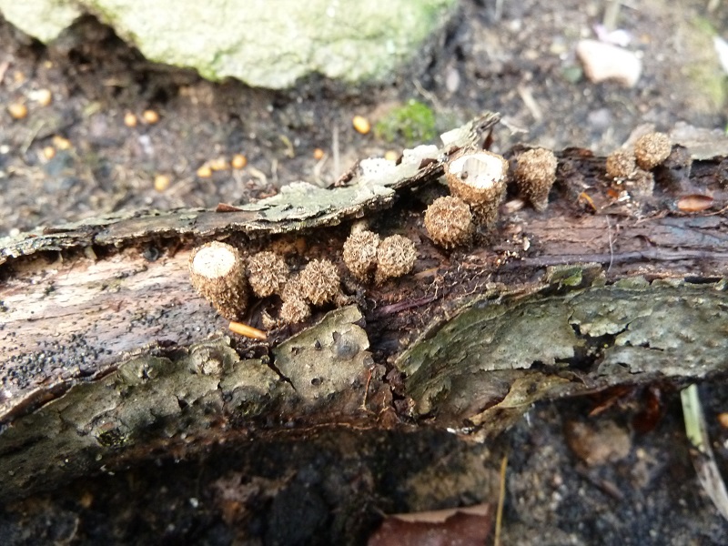 Heute finde ich darauf knapp fingerhutgroße bräunliche Fruchtkörper und dachte (ohne Lesebrille) zunächst an kleine Stäublinge. Mit Lesebrille war die Fehleinschätzung offensichtlich, es dürfte sich vielmehr um Teuerlinge handeln. Liege ich mit gestreifter Teuerling richtig?