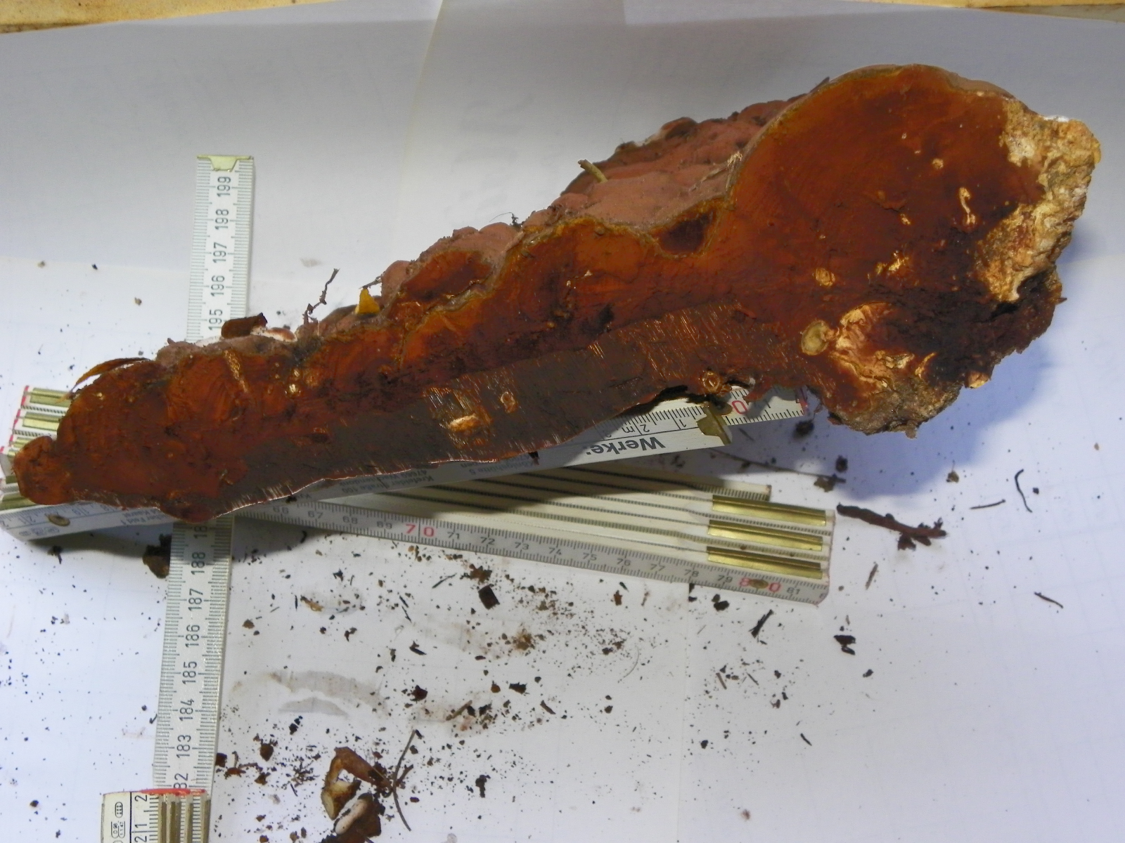 Das Sporenpulver ist lecker kakaopulverbraun und er wuchs am Stammfuß einer (dornenlosen) Gleditsien(sorte). Der Pilz verursacht eindeutig Weißfäule und ich kommte problemlos mit meinem Lieblingsfingernagel bis tief ins Innere des lebendigen Baumes graben, weshalb er sich auch ohne Weiteres vom Opfer lösen ließ.