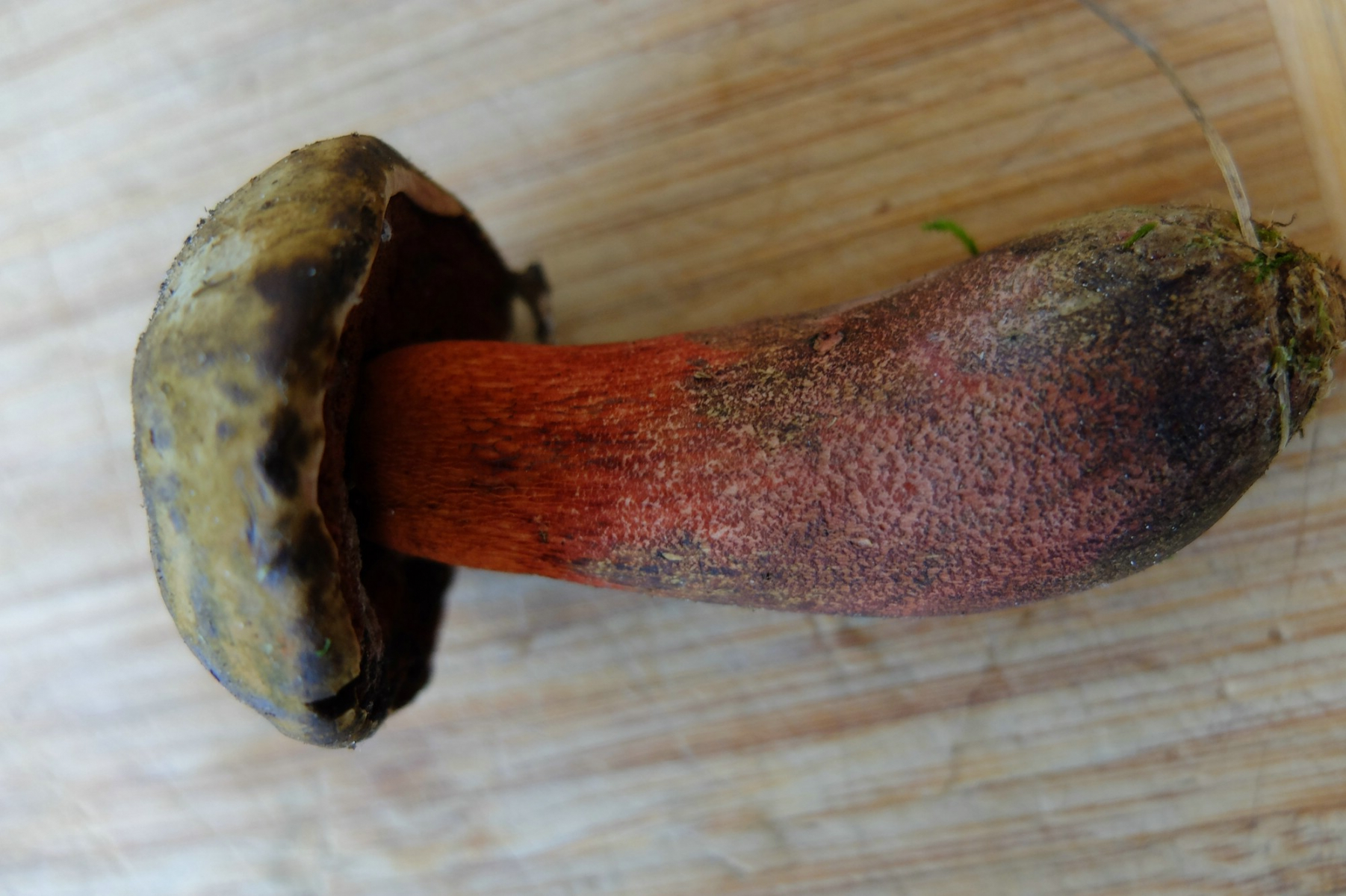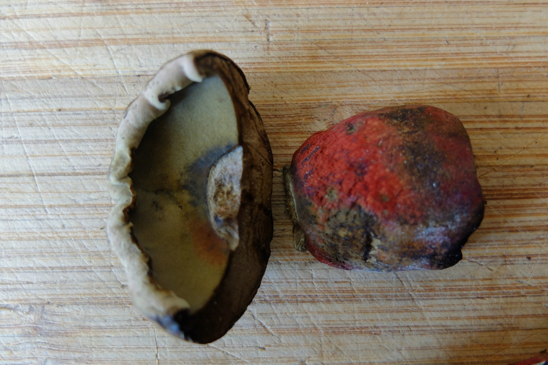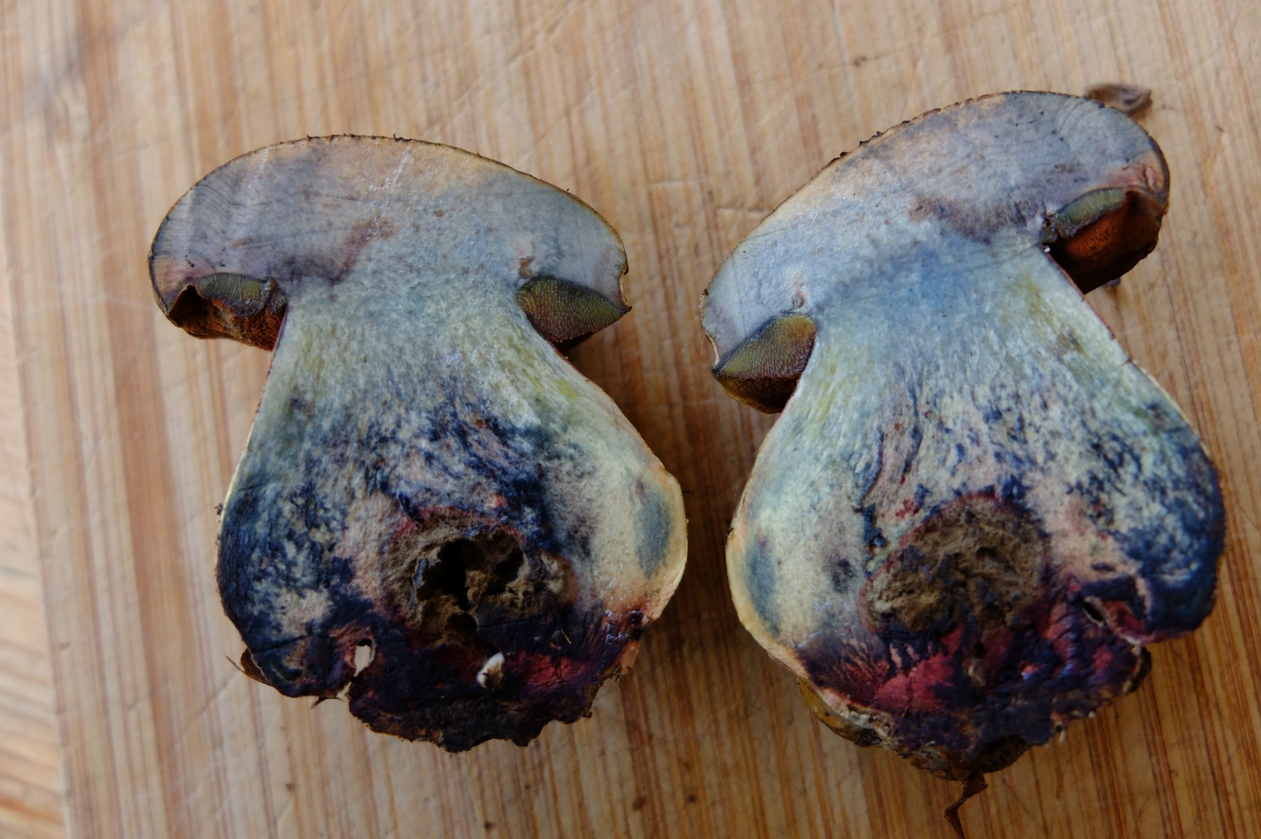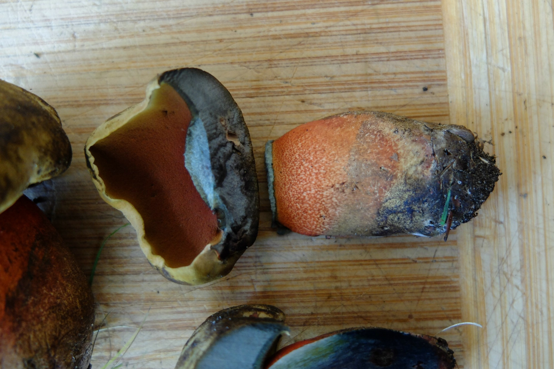 Also, für mich ist das Suillellus mendax. Der hat - genau wie Boletus (jetzt auch Suillellus, glaube ich?) queletii eine weinrote Stielbasis, und eben diese Kombination aus Netz und Flocken. Hutfarbe sollte auch hinkommen, etwas heller als bei Flockis. Blauen auf dem Hut kommt auch hin. Bei dem Röhrenboden müsste ich auch nochmal genauer gucken, das habe ich so schnell nicht gefunden.