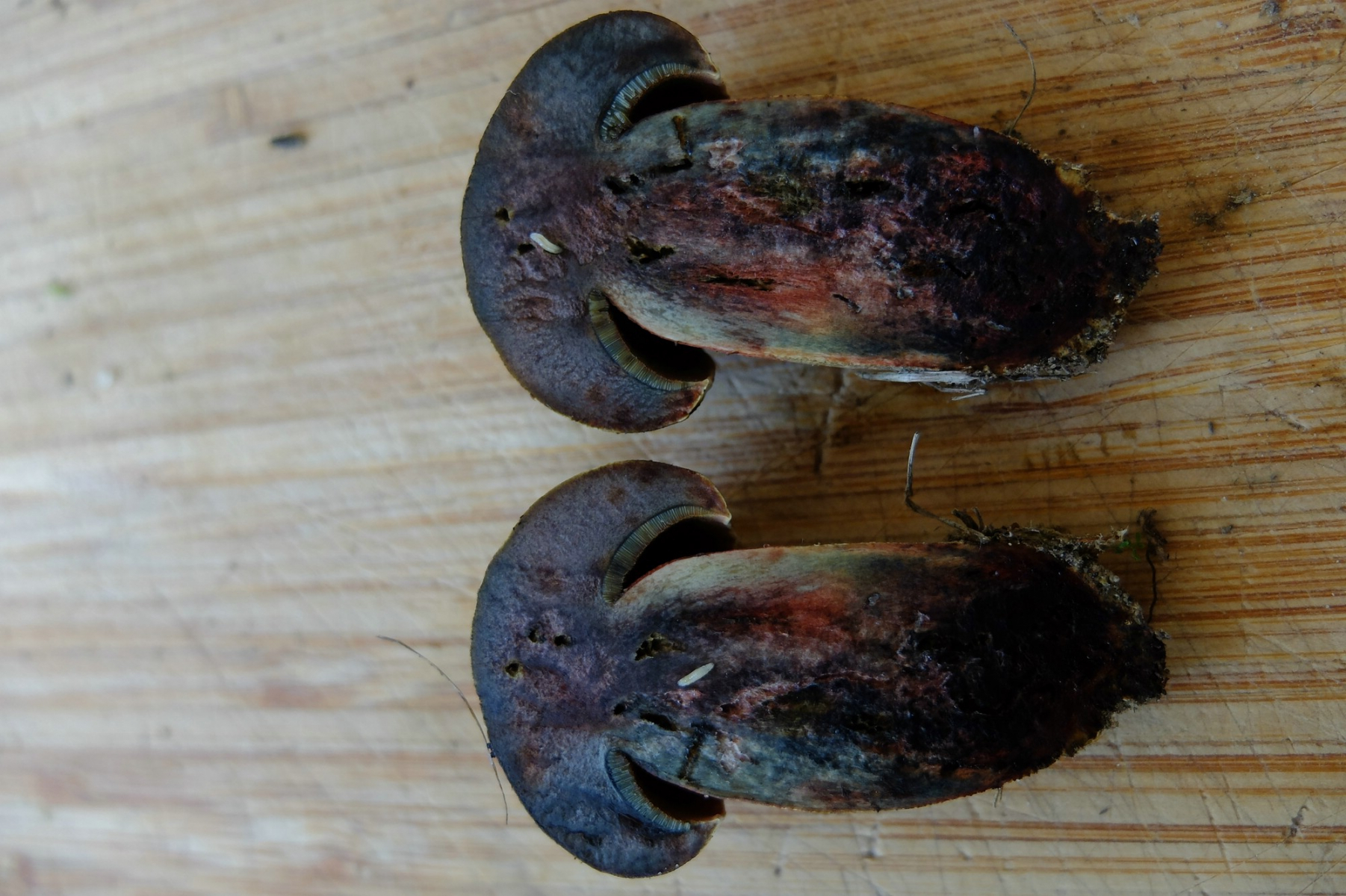 Erst wollte ich sagen, etwas untypische Netzhexen. Die Hutfarbe, das Netz und die vielen Maden deuten darauf hin. Aber ich habe noch keine Netzhexen gesehen, die bis in den Hut hinein im Schnitt röten. Das kann aber der Glattstielige.